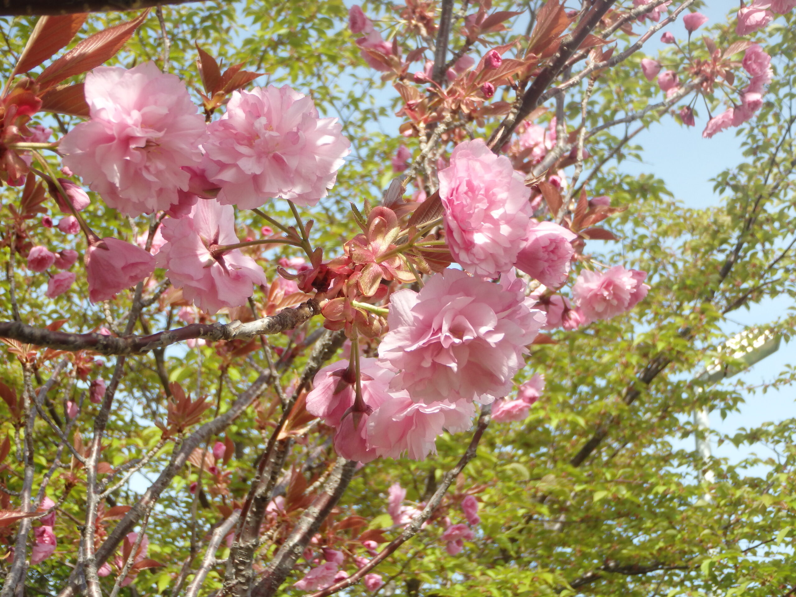 噴水広場より北側にある展望デッキ横の八重桜も満開です。