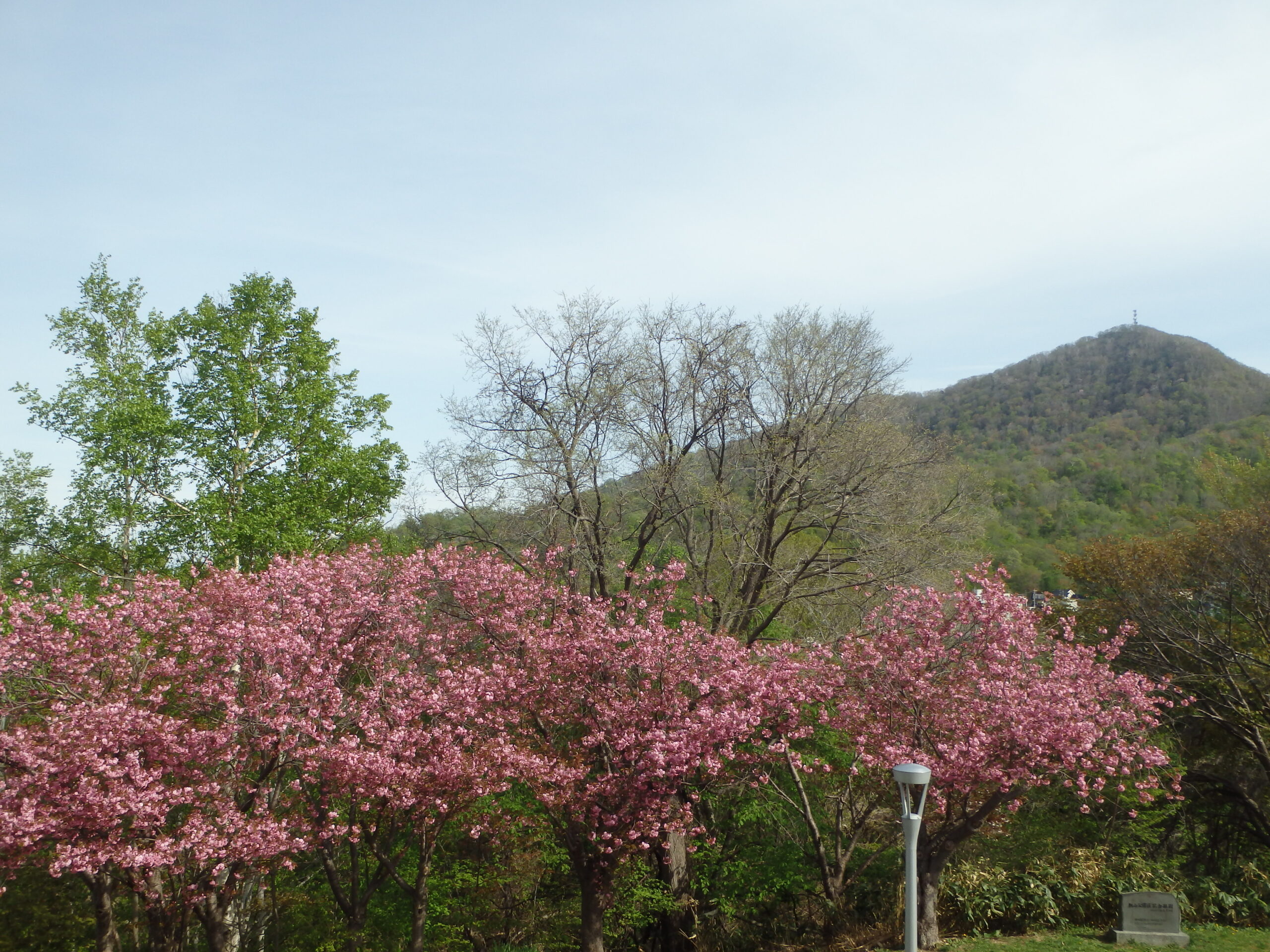 レストハウス横の八重桜と藻岩山。