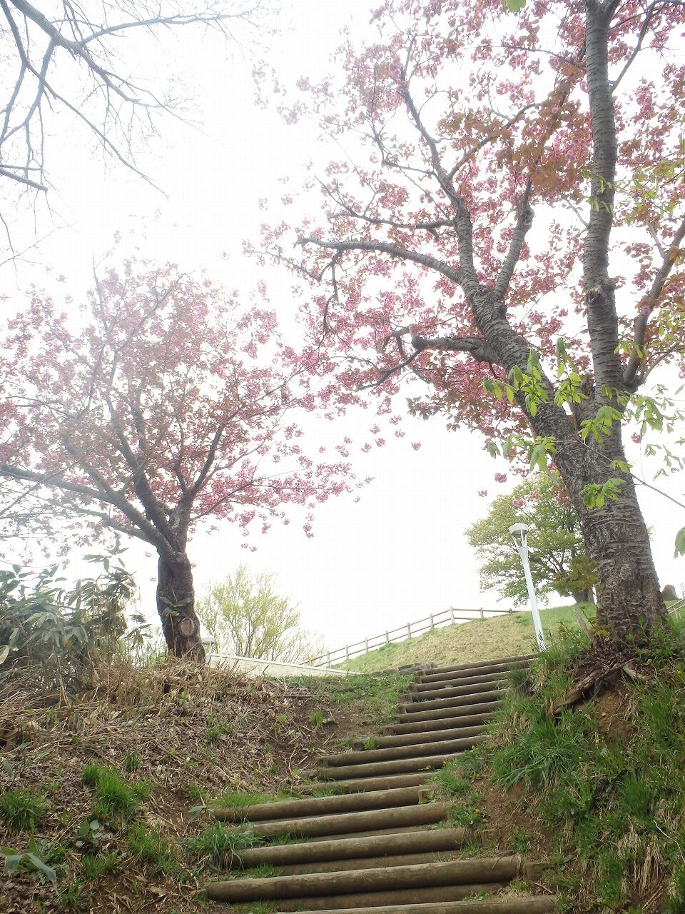 遊具広場から展望台に向かう木段を上ると、八重桜が出迎えてくれます。