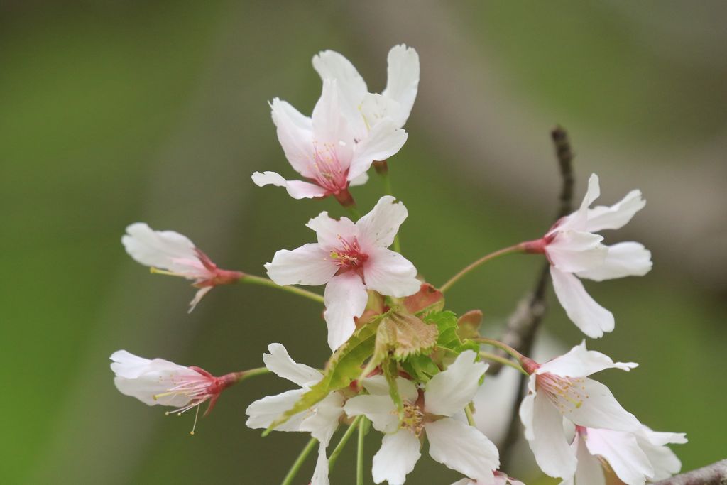 カスミザクラほどには花の色は白くなくピンクがかっており、花柄にはカスミザクラのような毛がない。