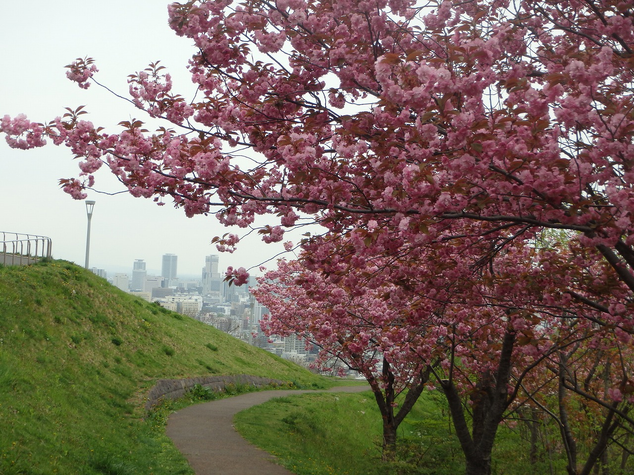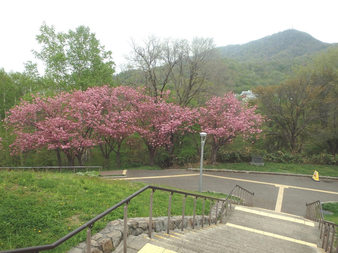 展望台階段を登って振り返った八重桜並木と藻岩山。