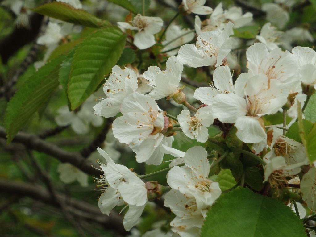 遊具広場で今咲いている白い花は、「さくらんぼがなる木」、セイヨウミザクラです。