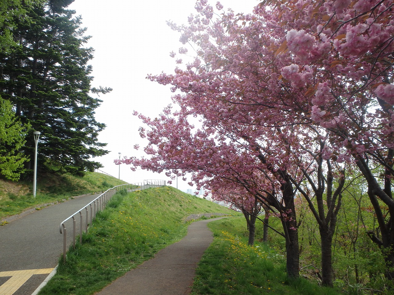 レストハウスの東側、スロープ沿いにある八重桜並木は引き続き満開、見頃です。