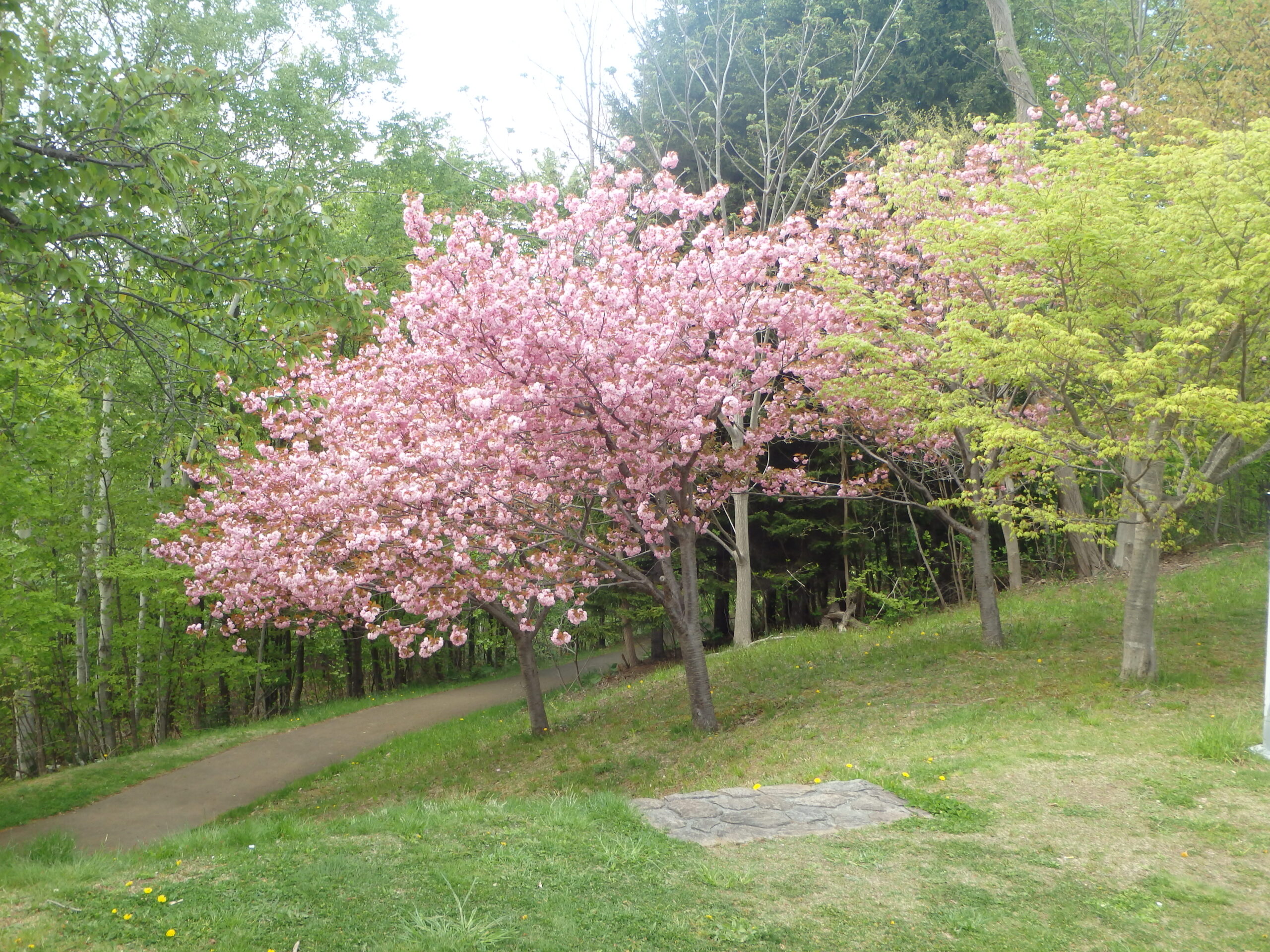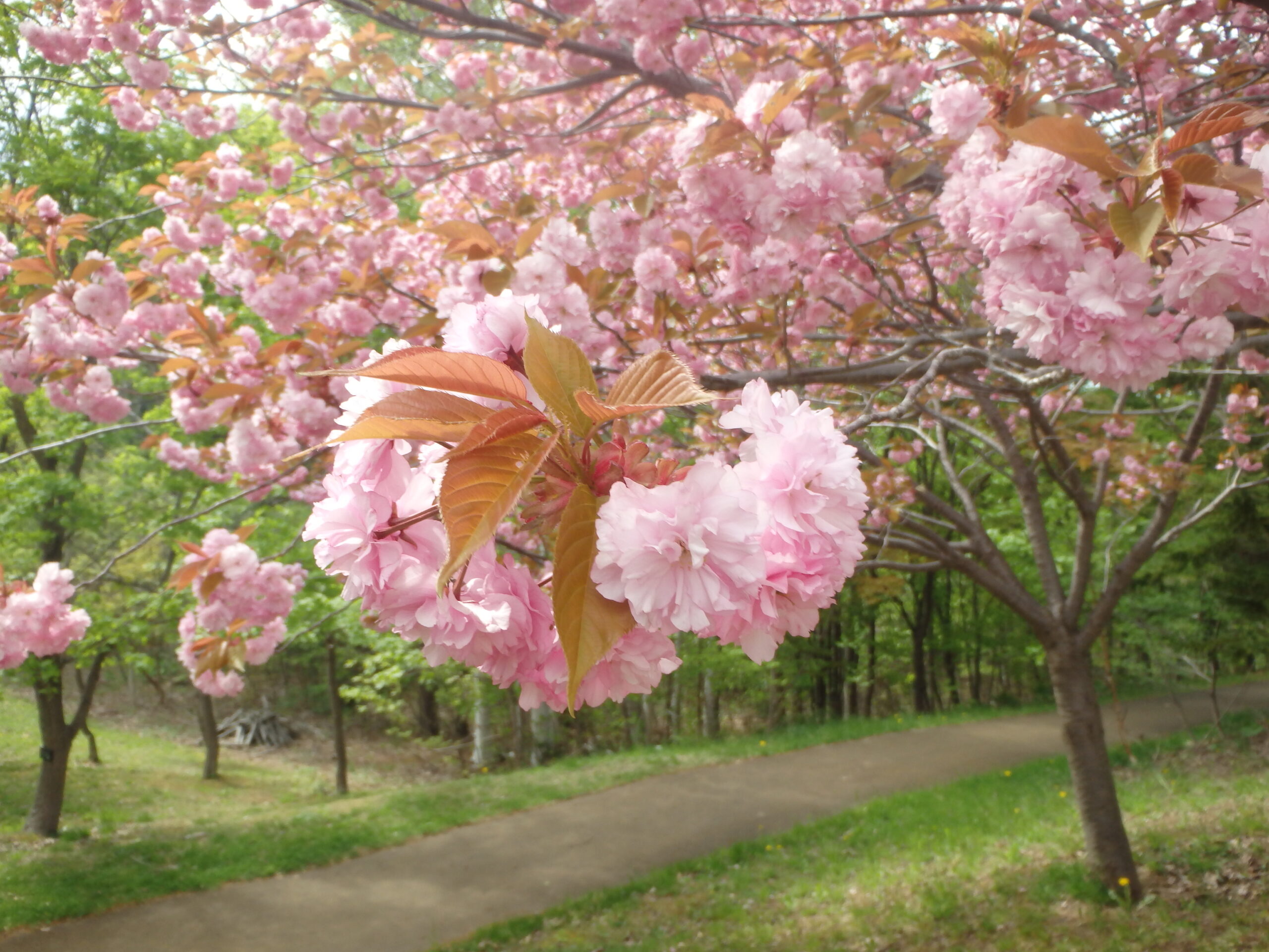 新桜並木から北側の散策路の八重桜が満開で見頃です。