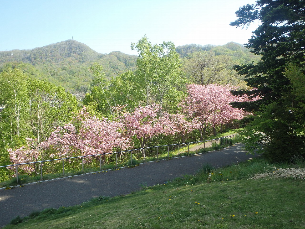 レストハウスの東側、スロープ沿いの八重桜の並木はまだ見頃です。