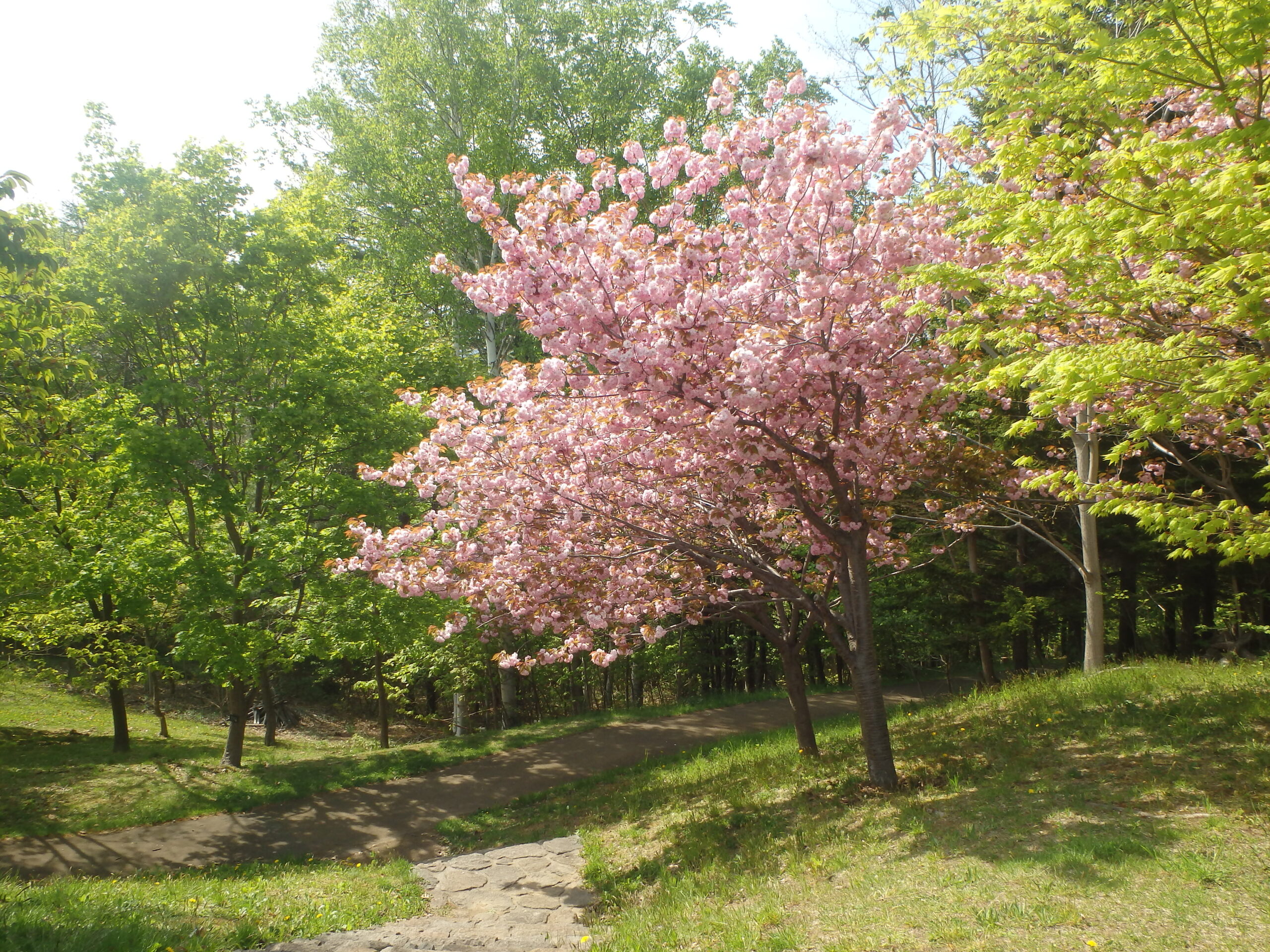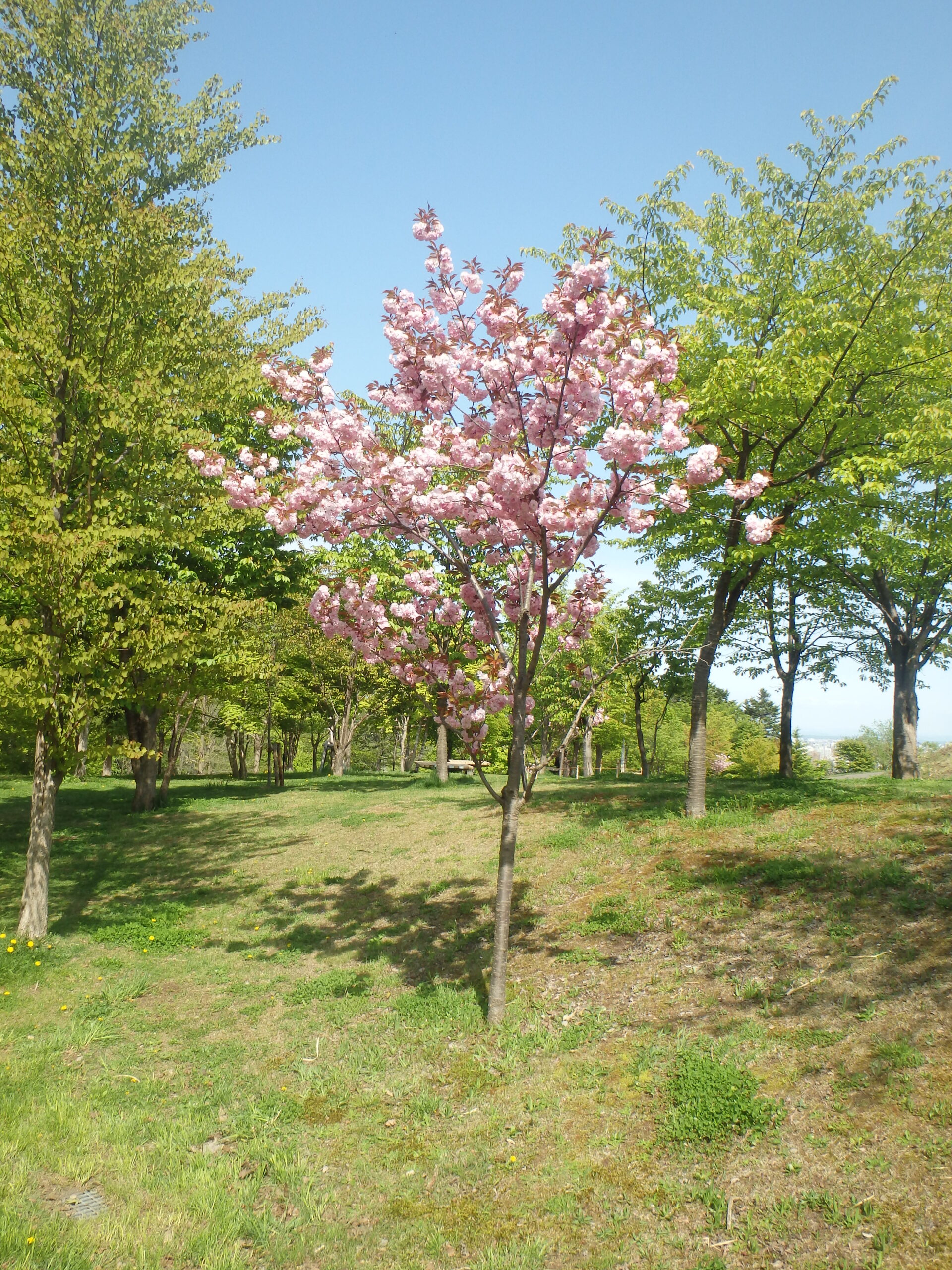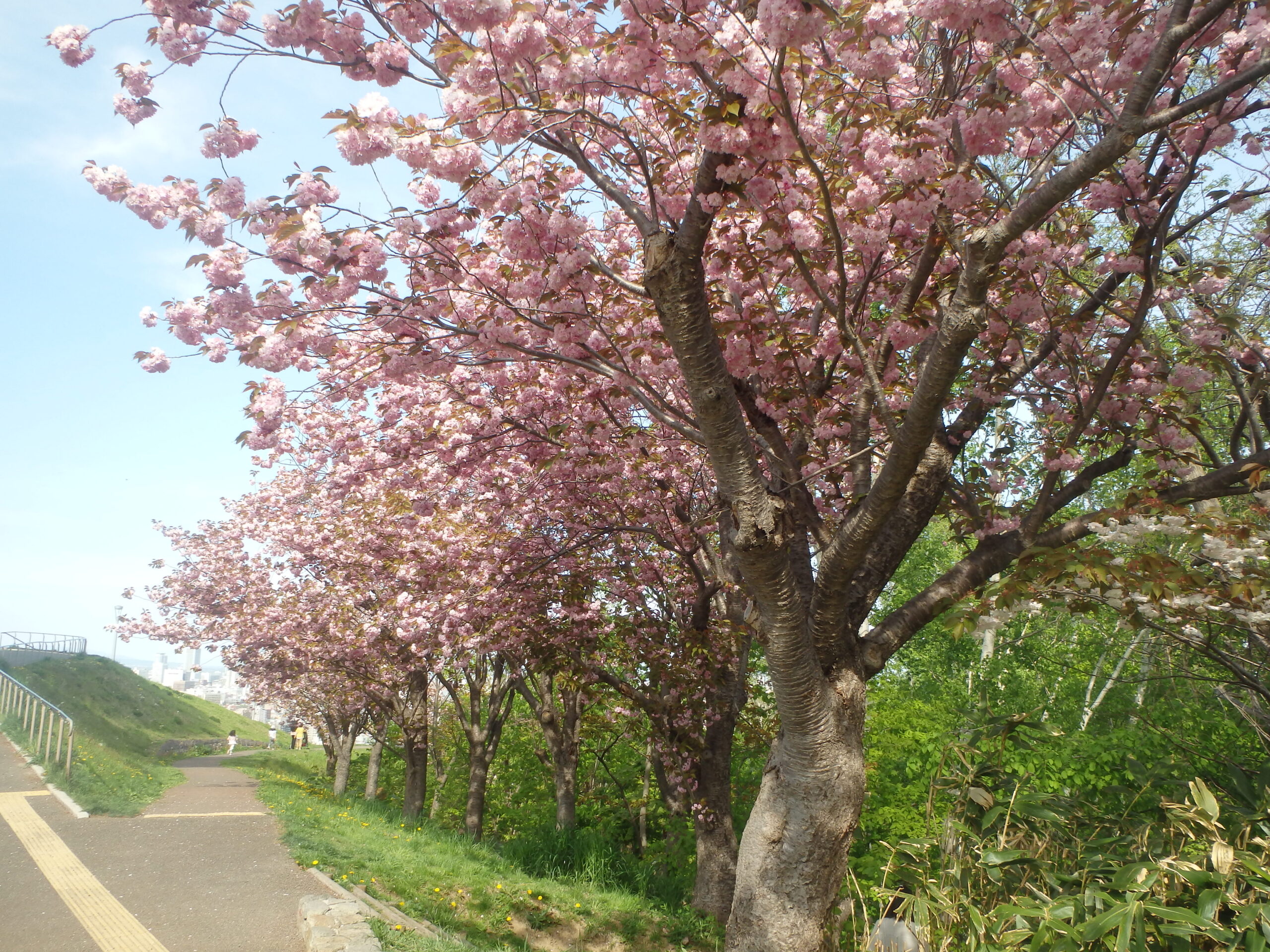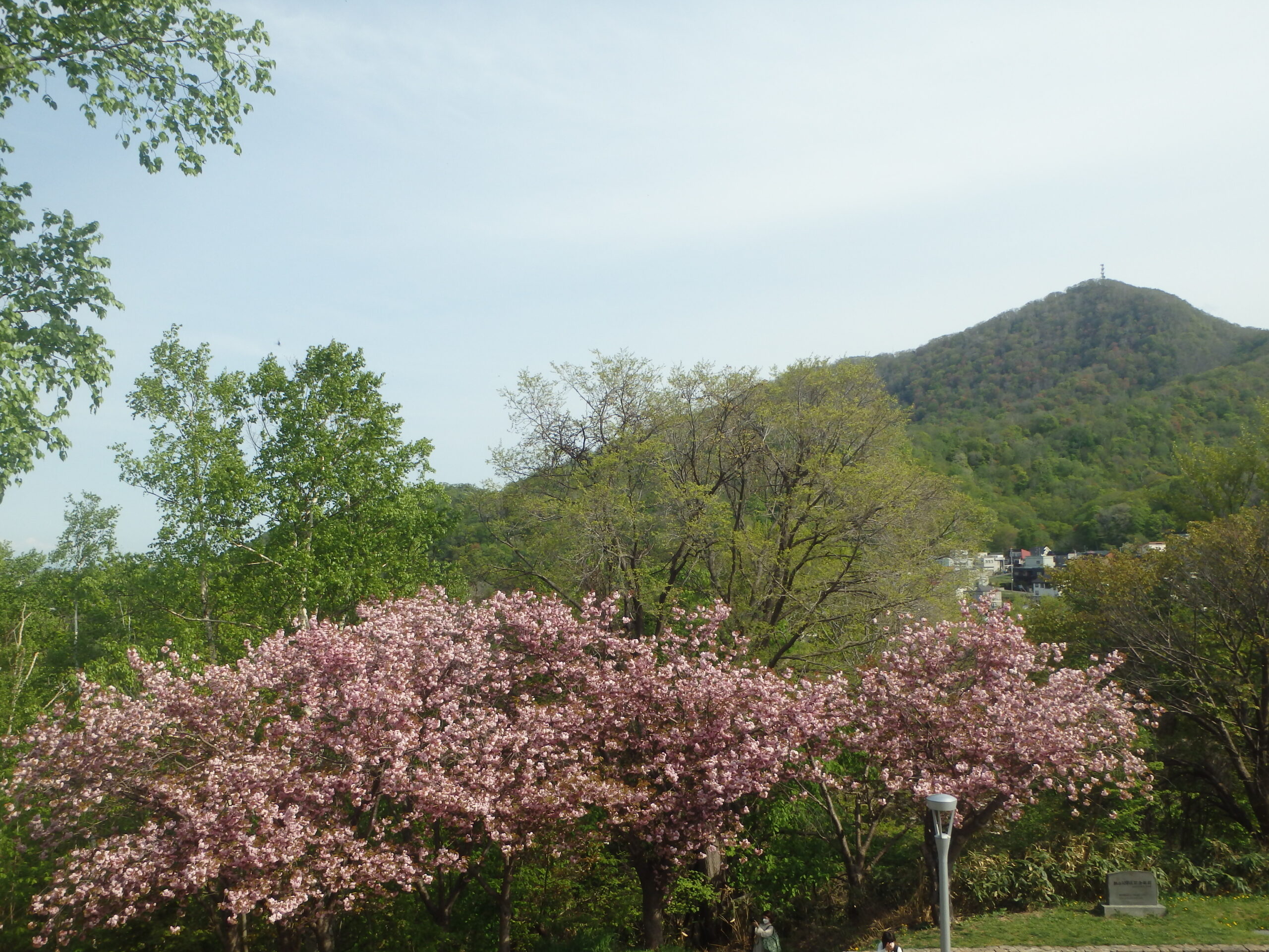 レストハウス横の階段から見た、八重桜と藻岩山。