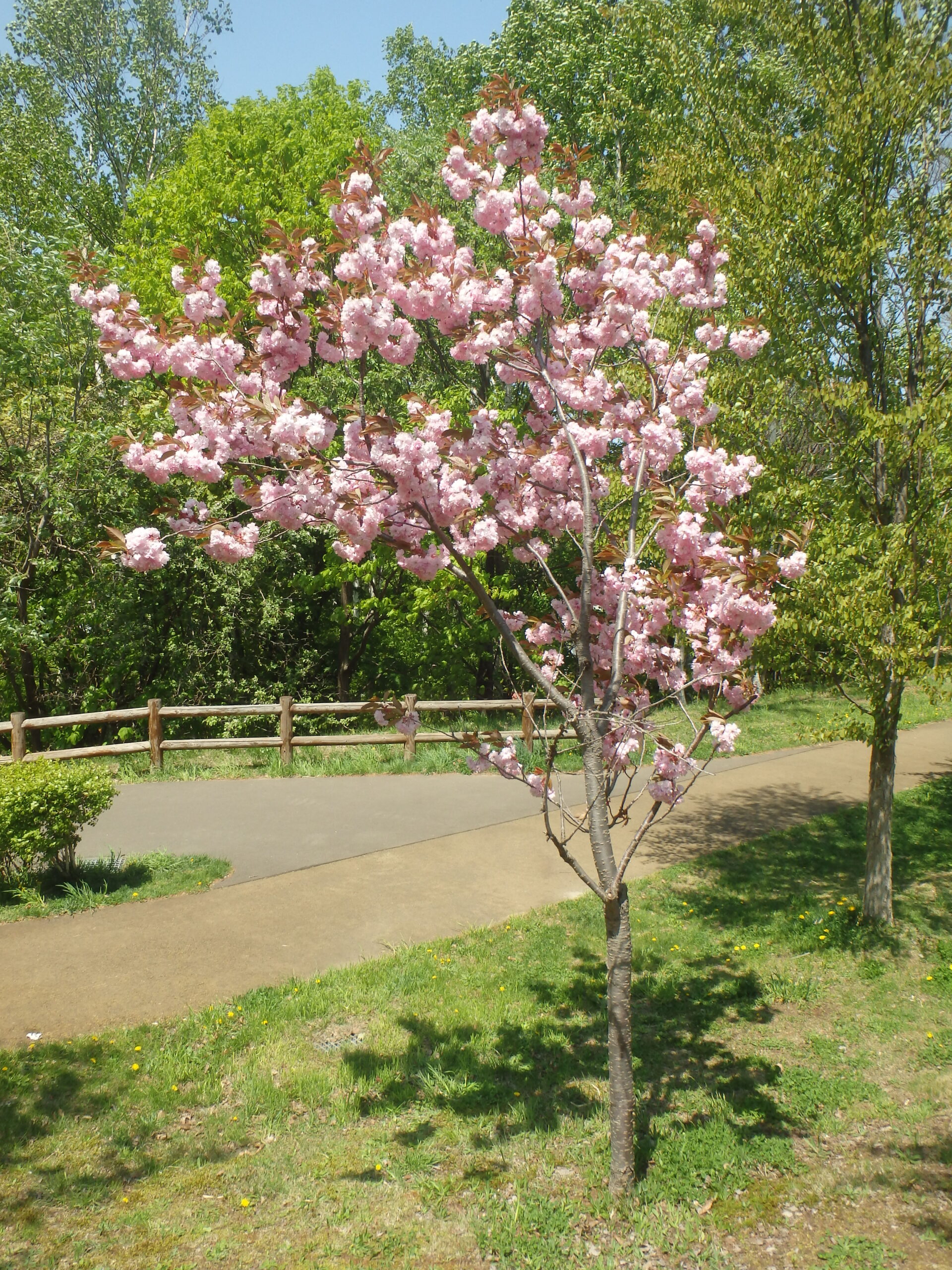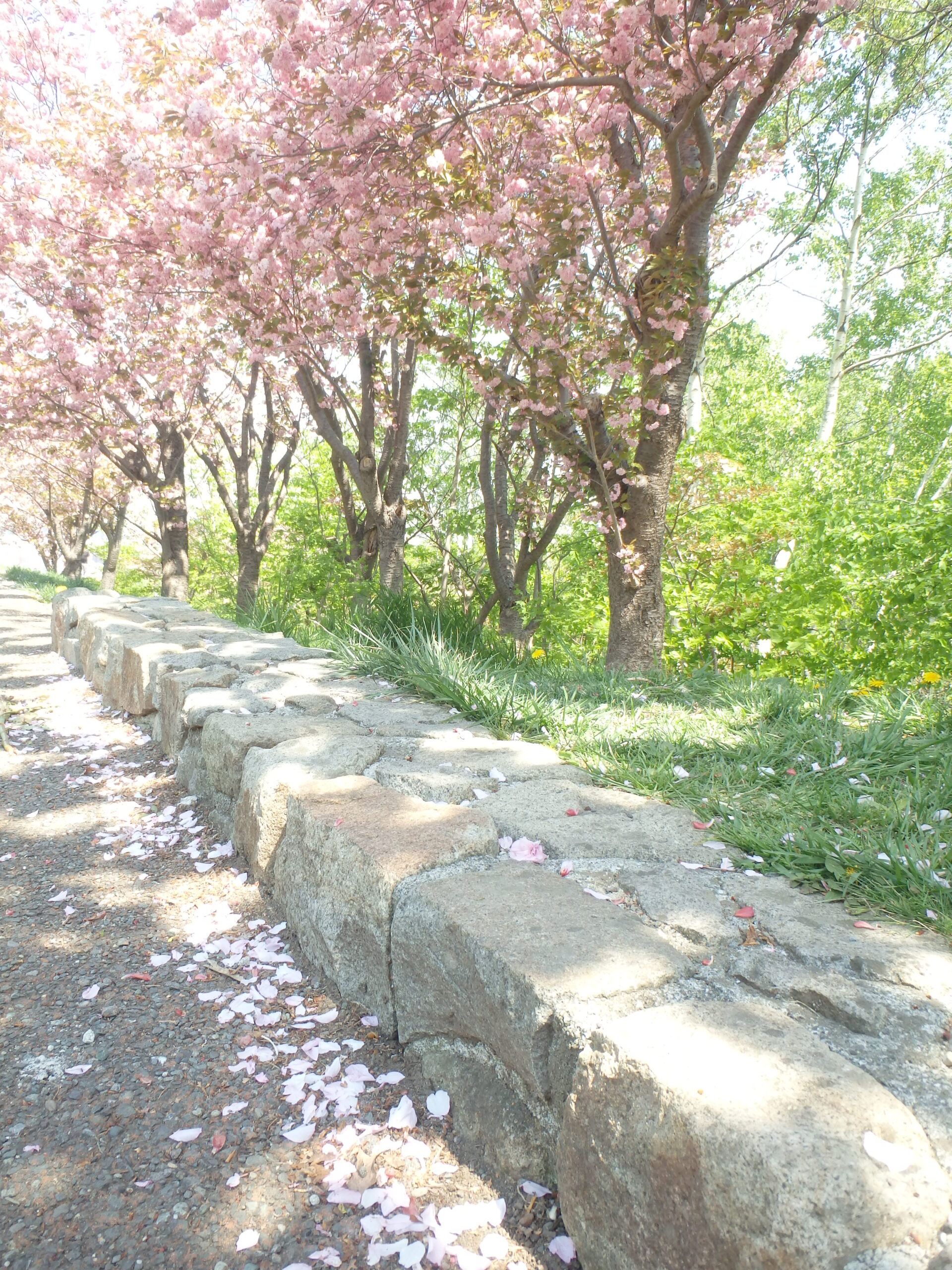 旭山記念公園は八重桜が満開ですが、花びらが落ち始めてきております。