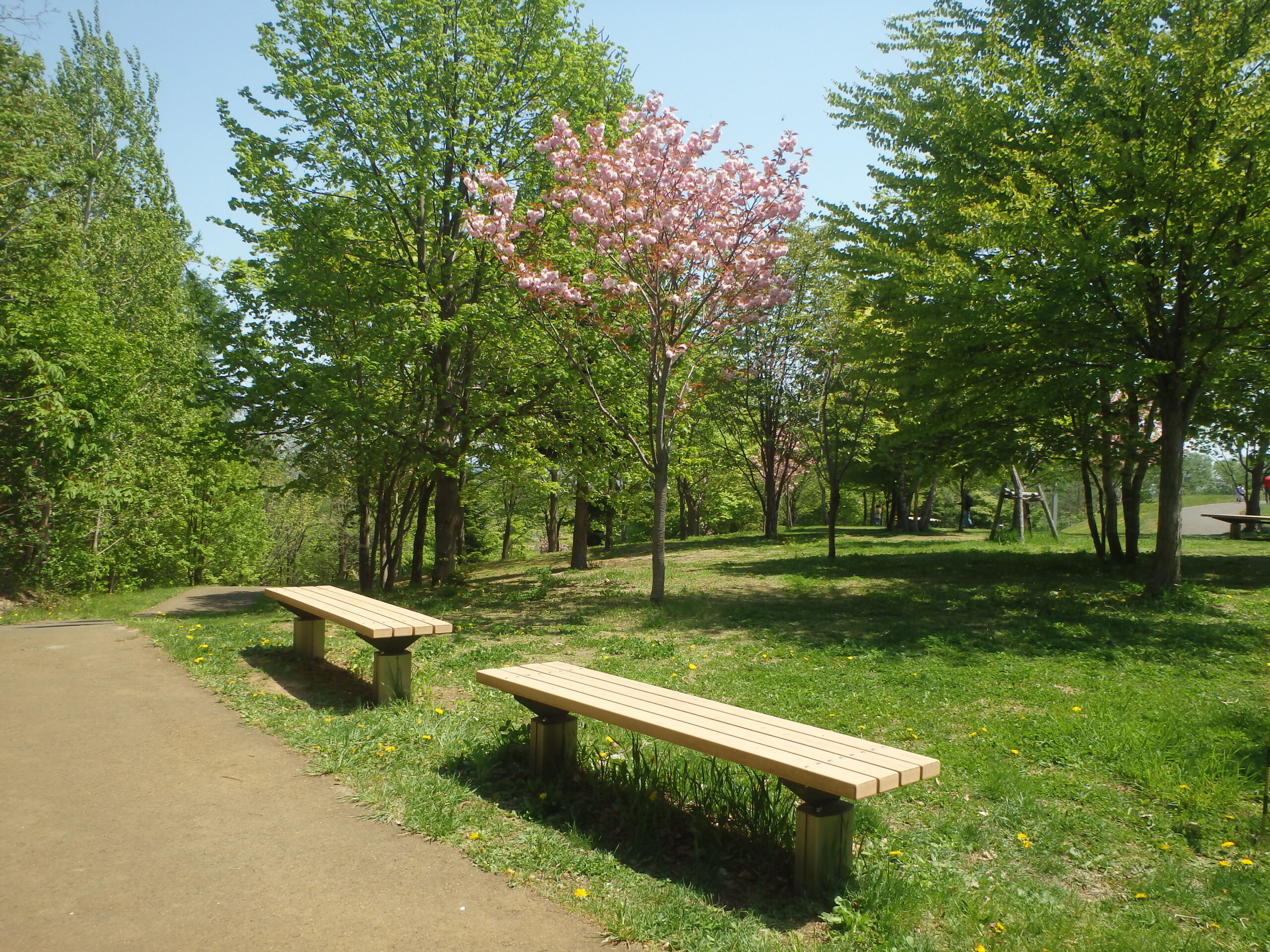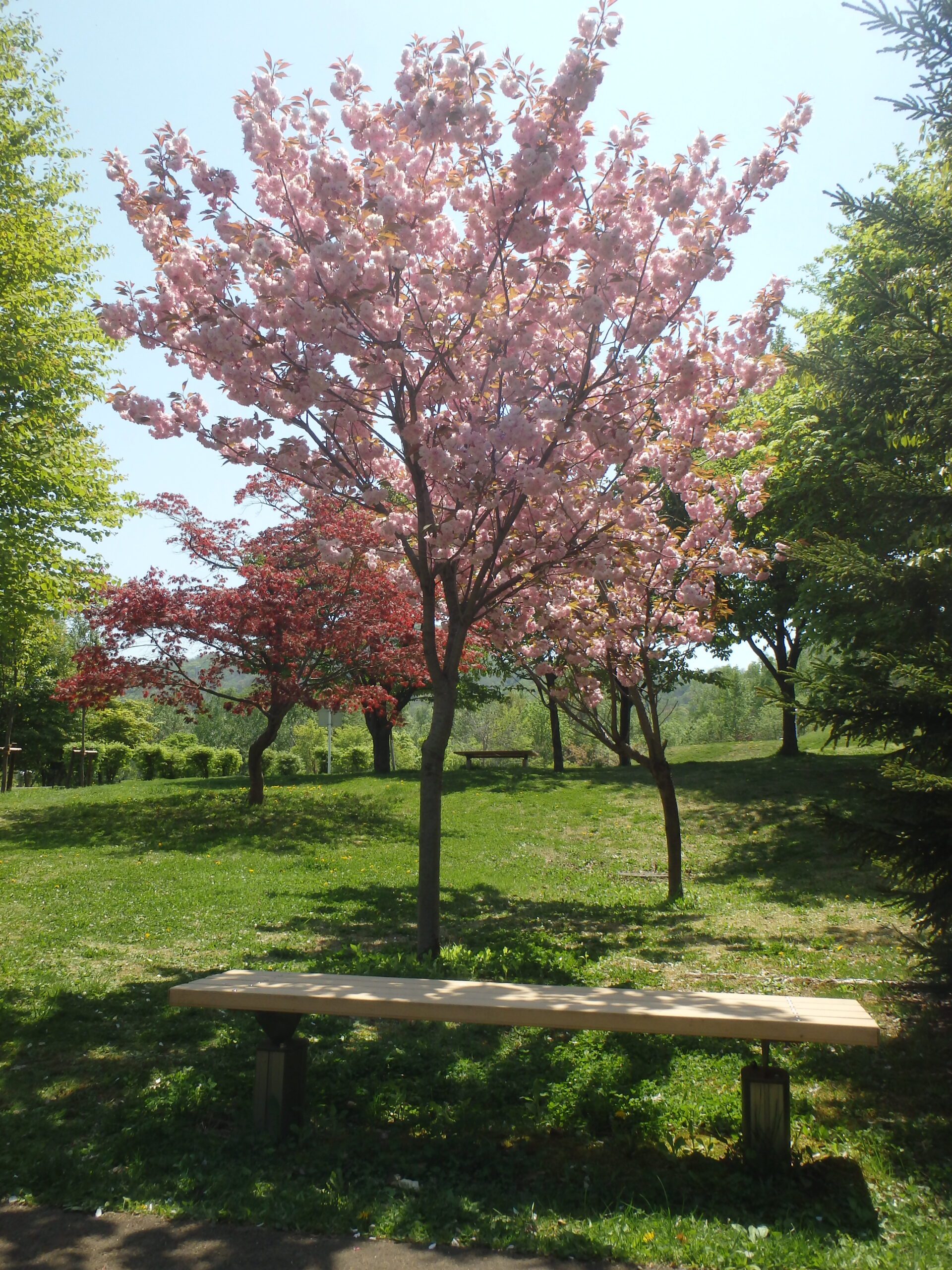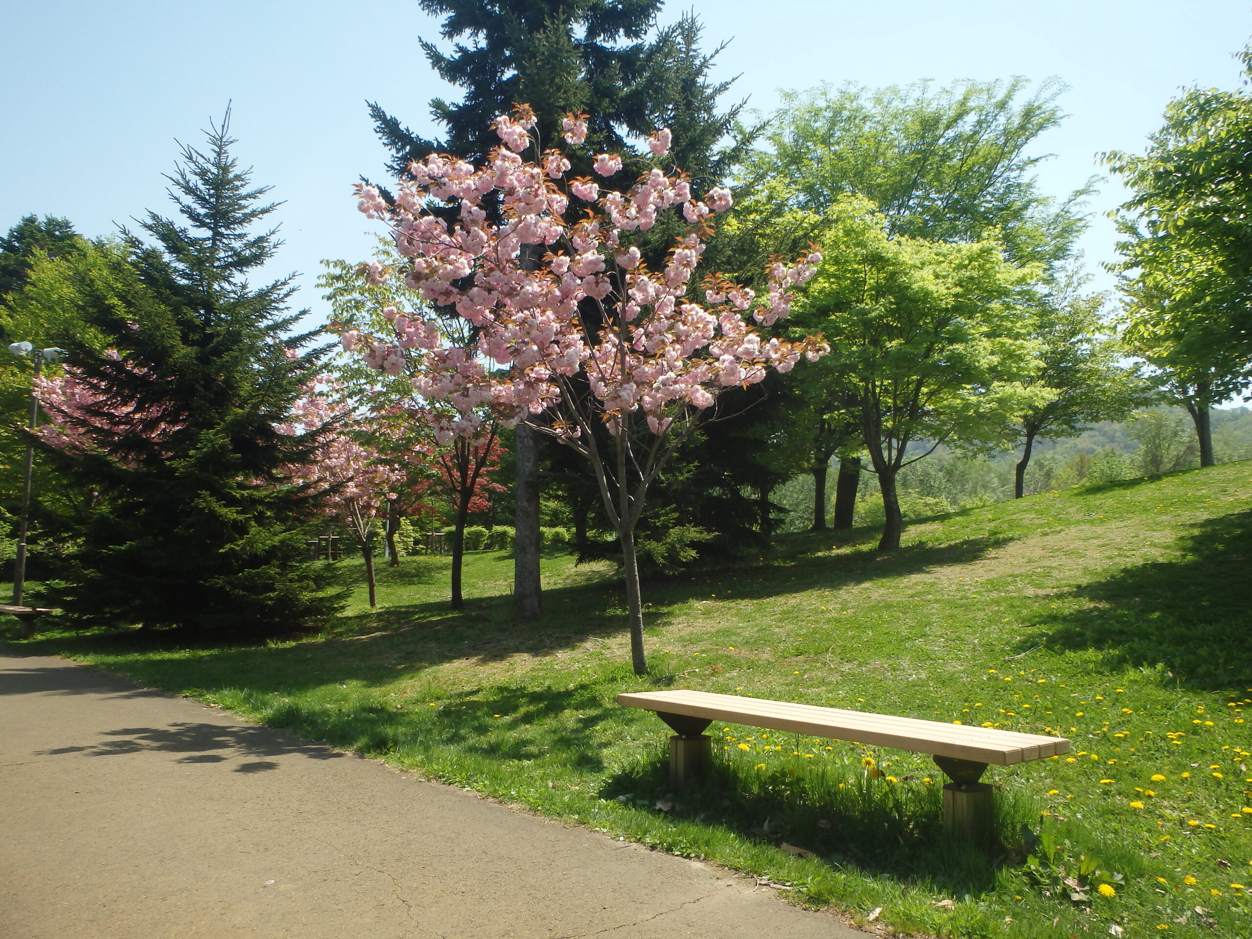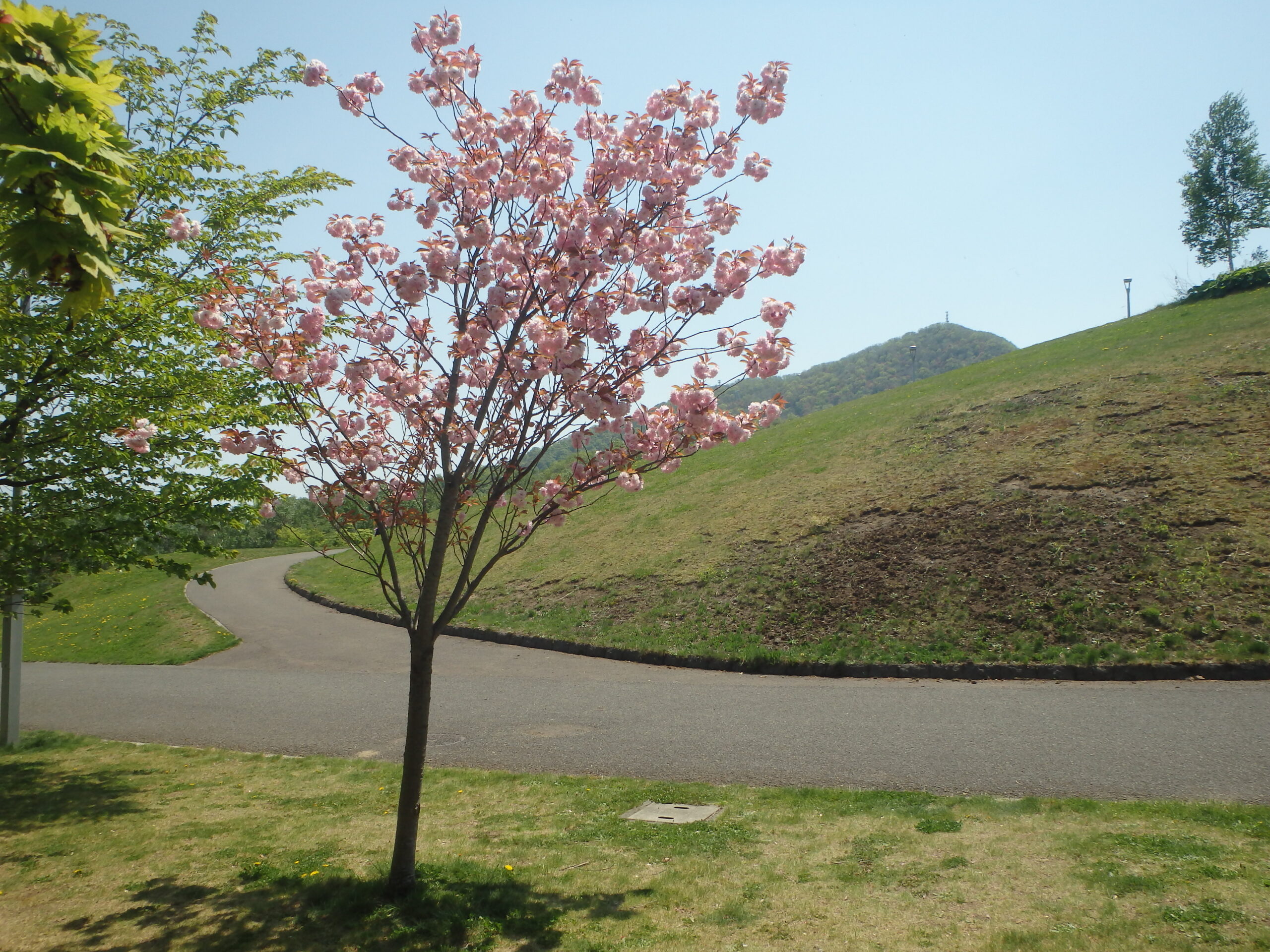 レストハウス西側のスロープを進んだ先の「新桜並木」の八重桜と藻岩山です。