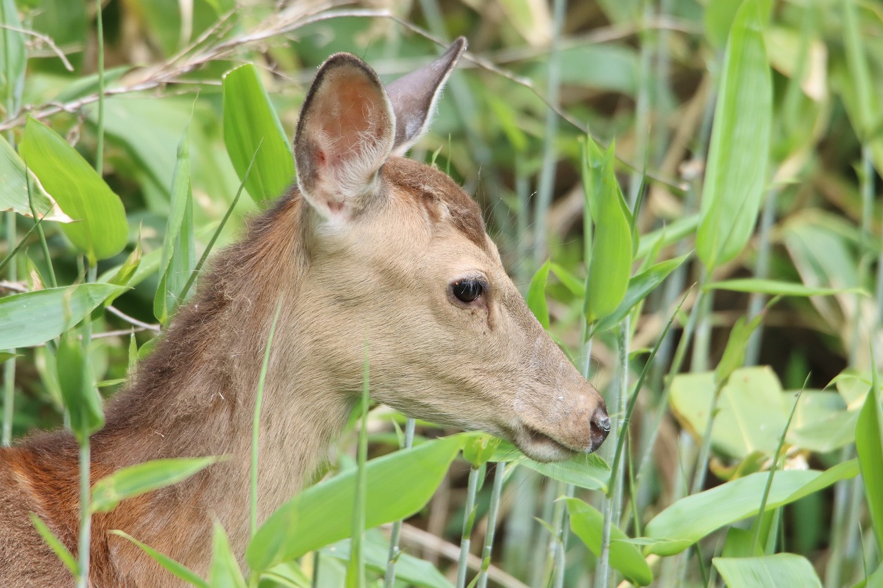 今週園内で見られたエゾシカの若い個体、2枚目、頭のアップを見ると角が生えかかっていて、昨年生まれた雄だと思われます。