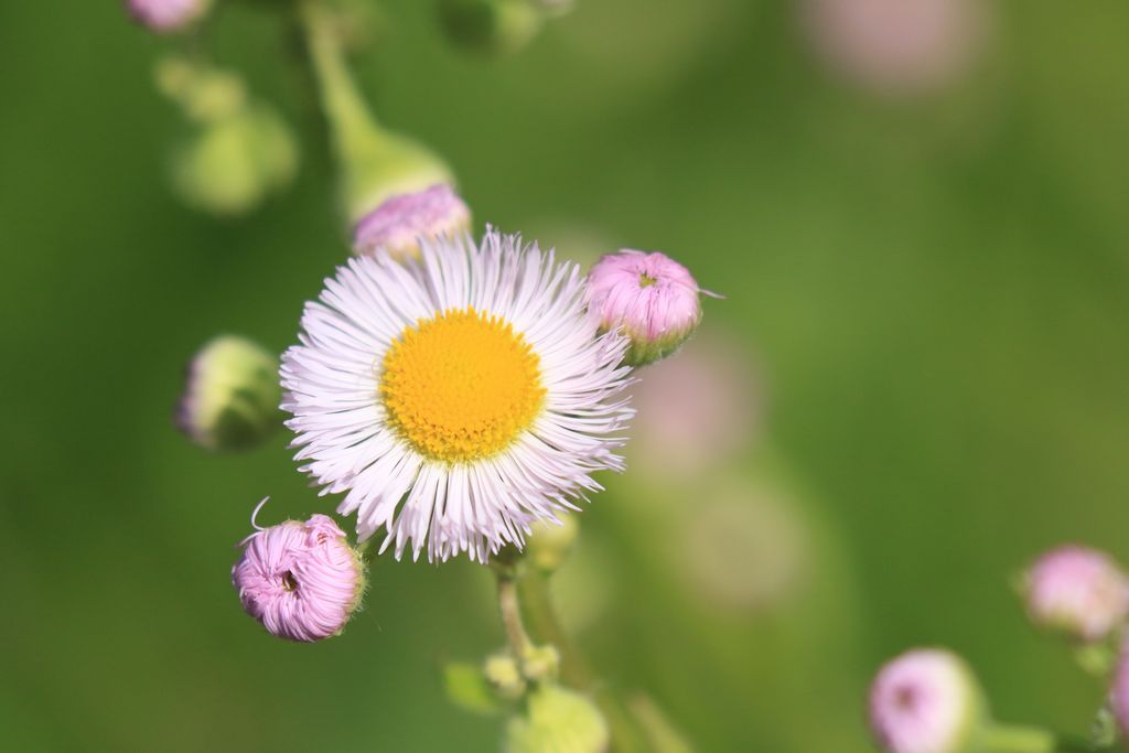 どちらも外来種でよく似たハルジオンとの主な違いは、ハルジオンは放射状に伸びる花びらのように見える部分(舌状花冠)が細い(ヒメジョオンはやや太い)、茎が中空、といったところで、花もハルジオンの方がピンク色みが強いです。