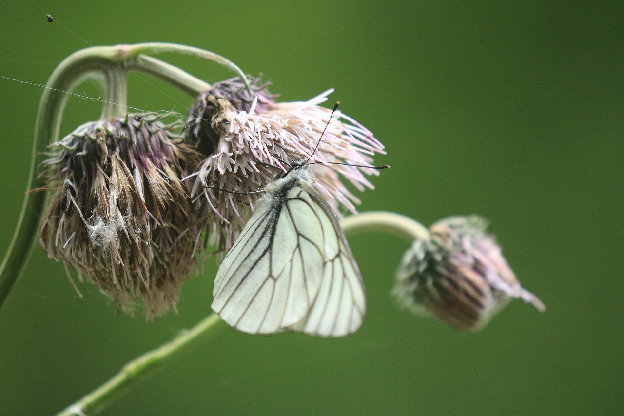 写真はチシマアザミの花にとまっているエゾシロチョウです。