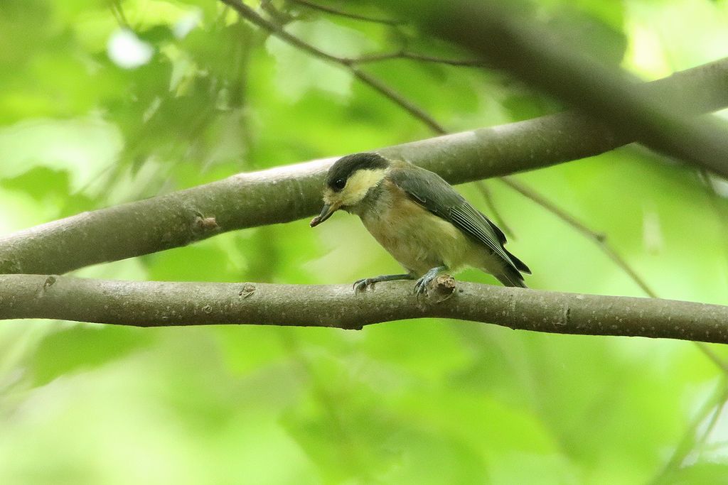 写真、ヤマガラの幼鳥は成鳥のような橙色の部分がないか薄いのですぐに分かります。