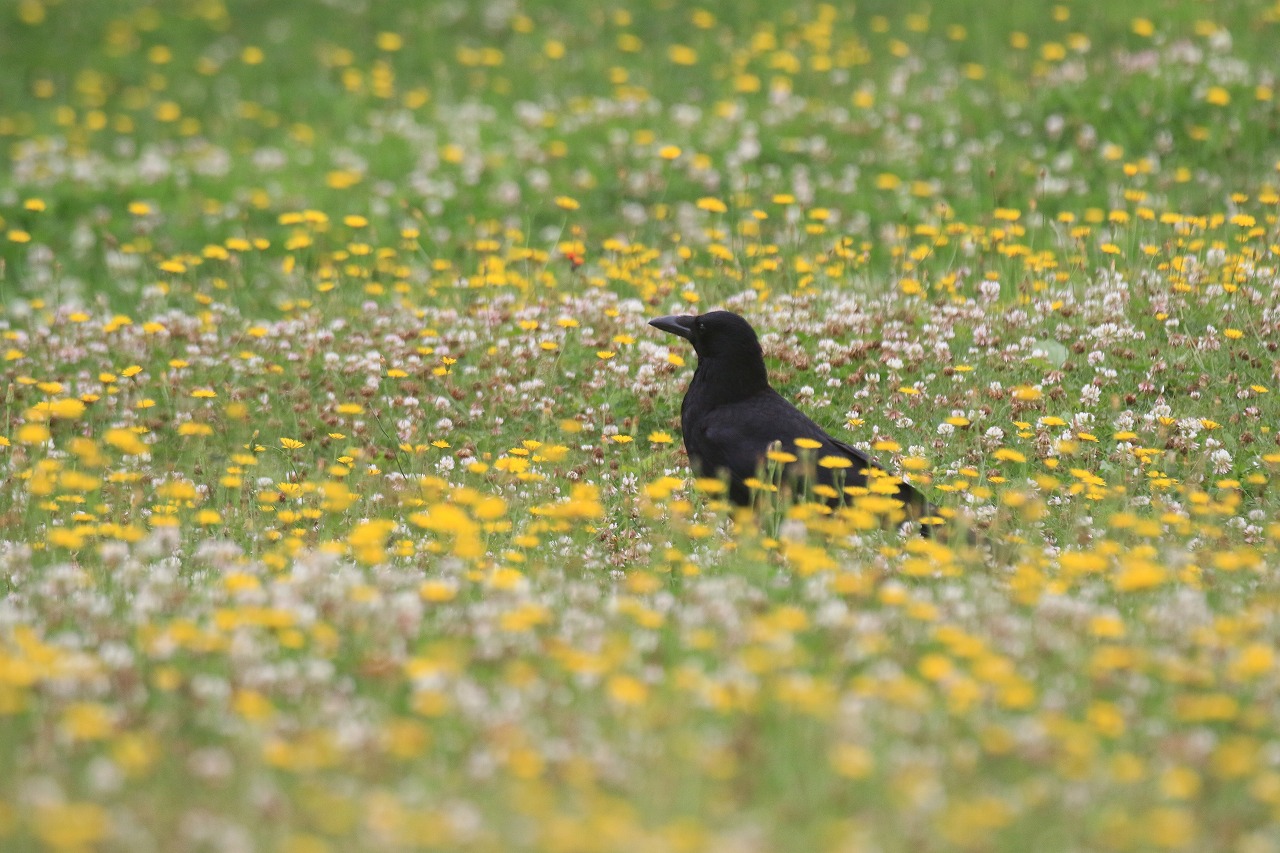 写真は展望台下テラス状階段西側の「ブタナ畑」を歩くハシボソガラスです。