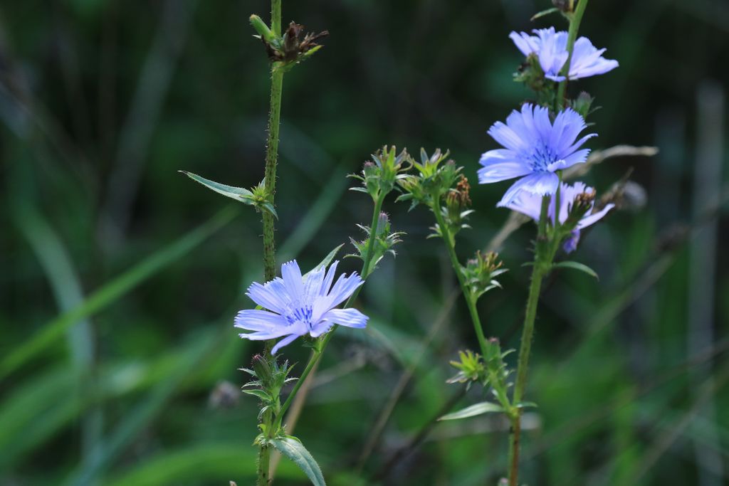 「舗装道路」沿い、展望台北西側の斜面のキクニガナ(チコリ)、7月上旬に咲き始めてまだ咲いています。