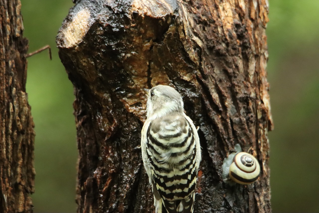 またコゲラ、ではなくここで注目はその向かって右にいる「かたつむり」、サッポロマイマイ。