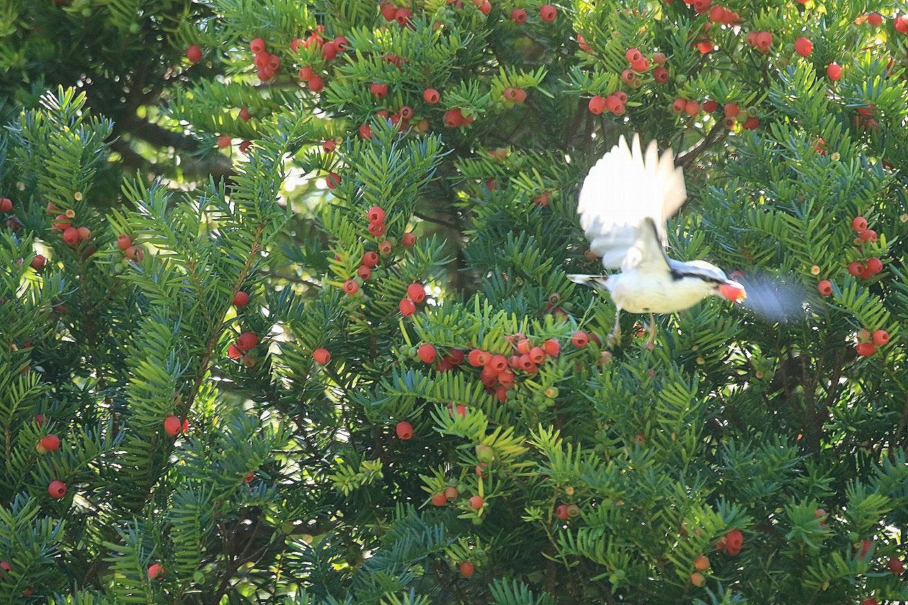 イチイ(オンコ)の実が赤くなり、ヤマガラも本格的に種子を食べに来るようになりました。