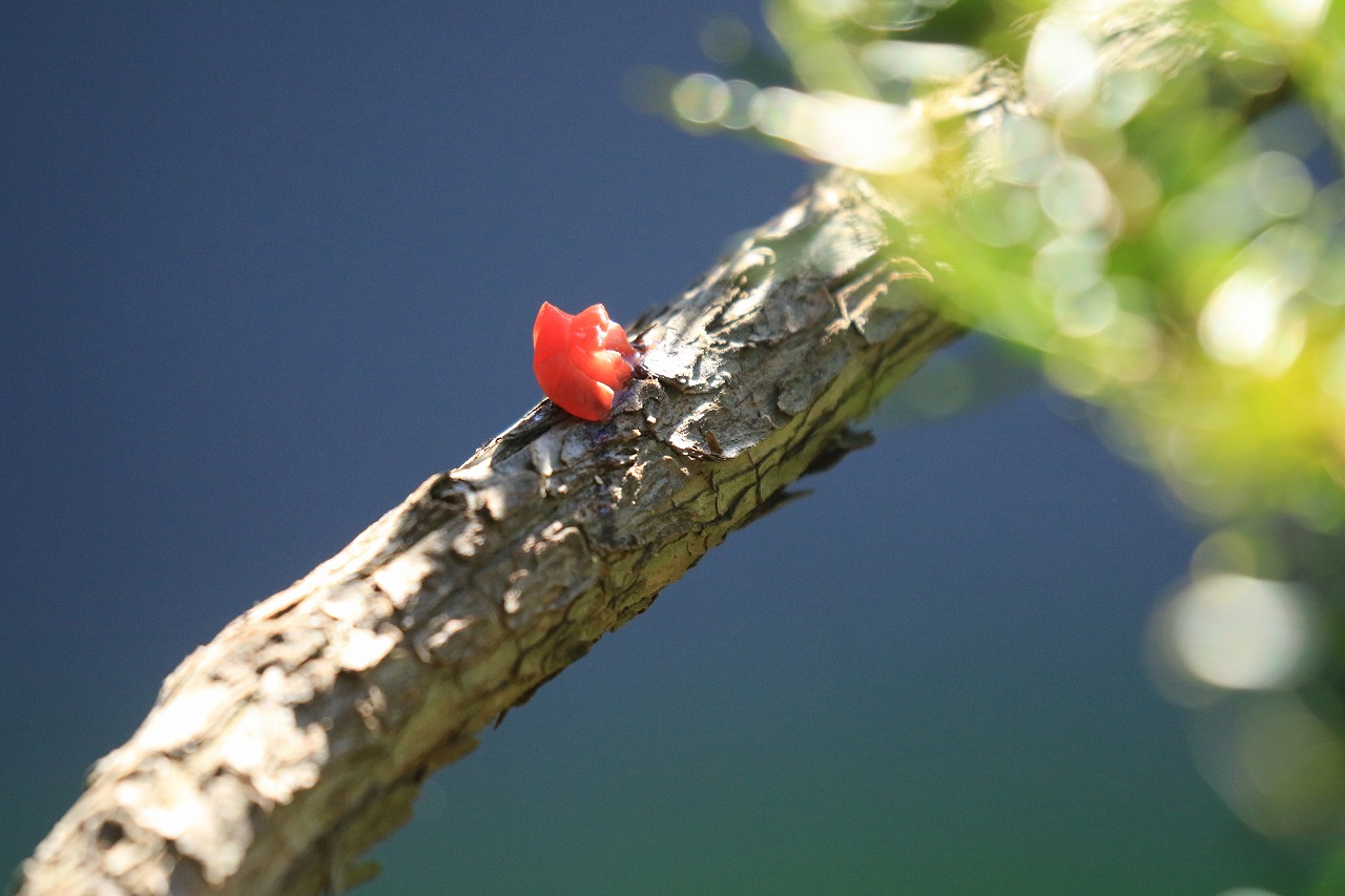 写真上から3枚目、種子を取り出す際に、ヤマガラやゴジュウカラは外側の赤い部分を枝などに擦りつけてそぎ落とし、種子だけを食べますが、このように赤い実だけ残っていることがあります。