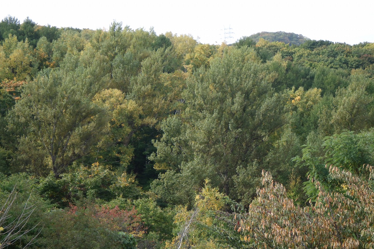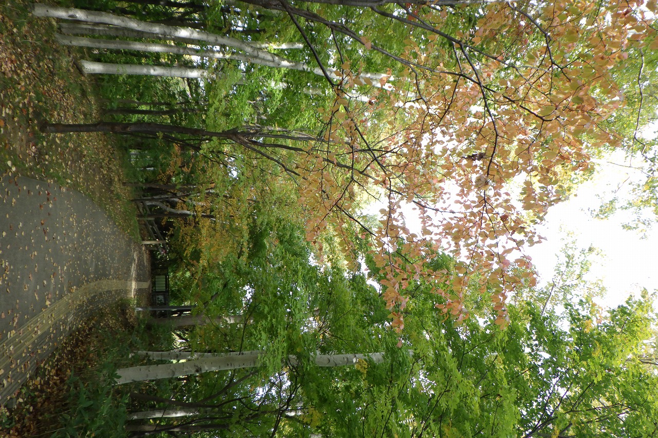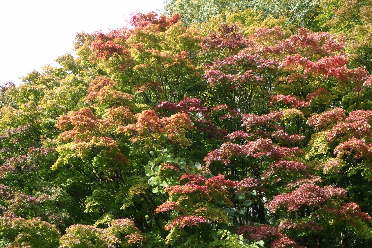 旭山でいちばんきれいに色づくヤマモミジもだいぶ赤くなってきましたが、周りの主にシラカンバがまだ黄色くなり始め、赤と黄のコントラストはもう少し先です。