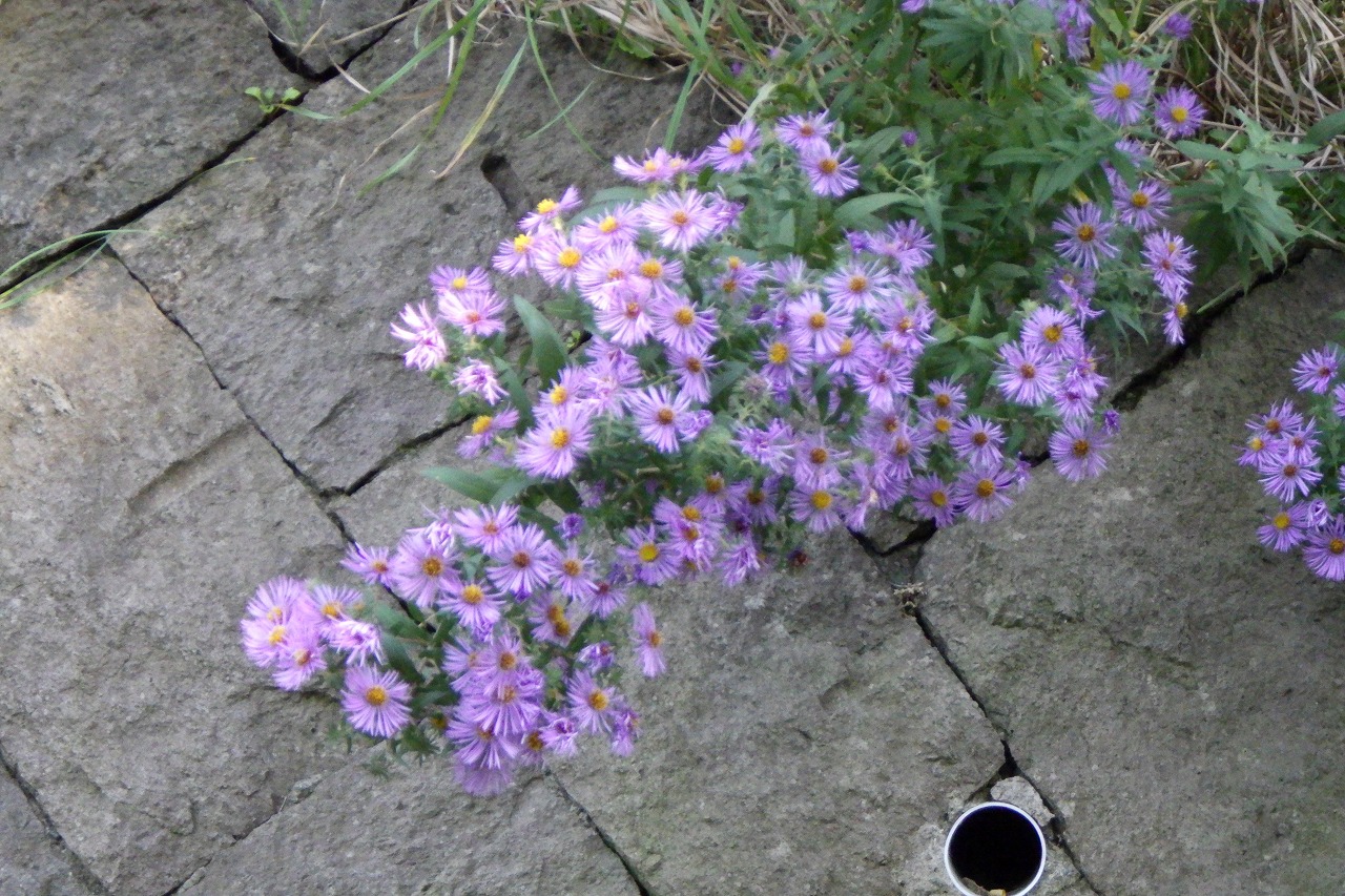 アーチ橋下石垣の上から下に延び出してきているネバリノギク。
