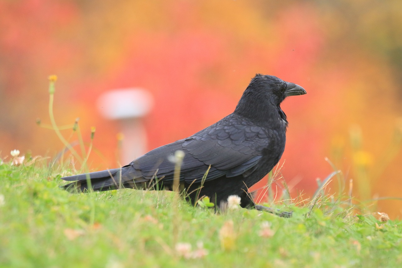 ハシボソガラスはよく「段状テラス」の芝生を歩いており、この時期には紅葉を背景に撮ることができます。