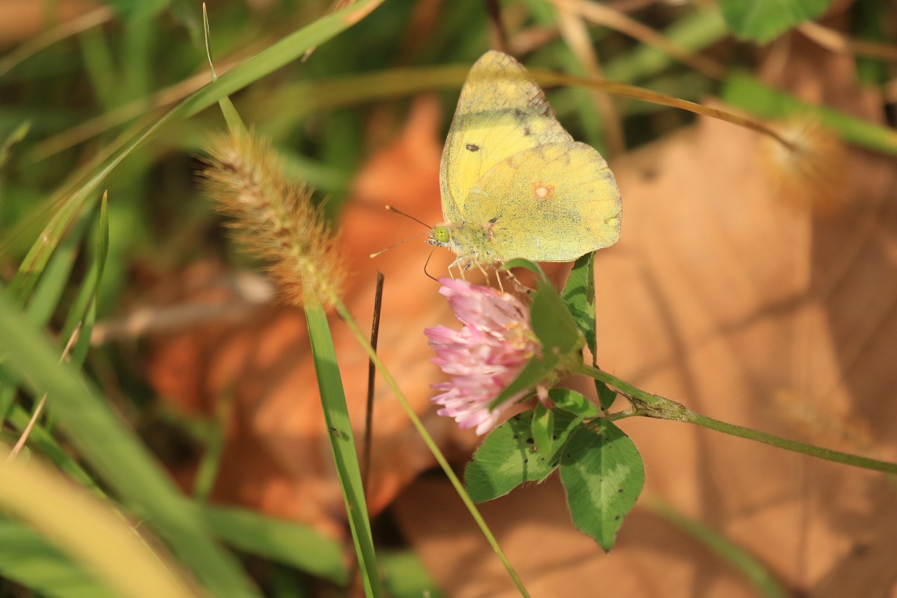 モンキチョウがムラサキツメクサにとまっていました。