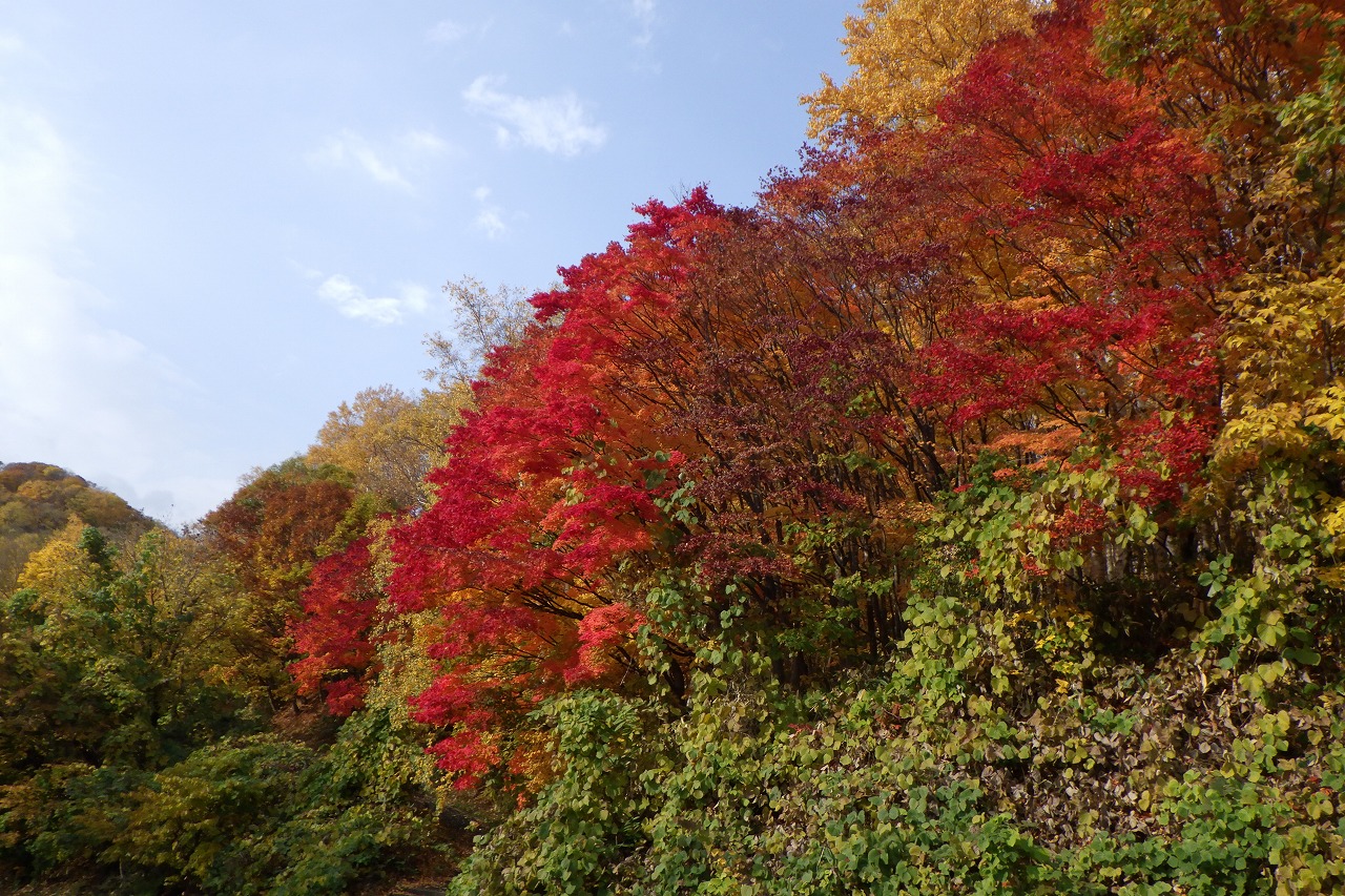 第Ⅰ駐車場入口のヤマモミジとその向こう、旭山でいちばんきれいに色づくヤマモミジ、駐車場内側から。