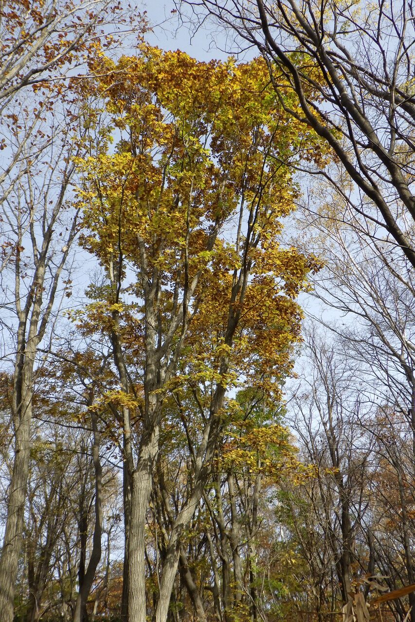 旭山でいちばんきれいに色づくヤマモミジ、落葉が進み、樹形が分かりにくくなってきました。