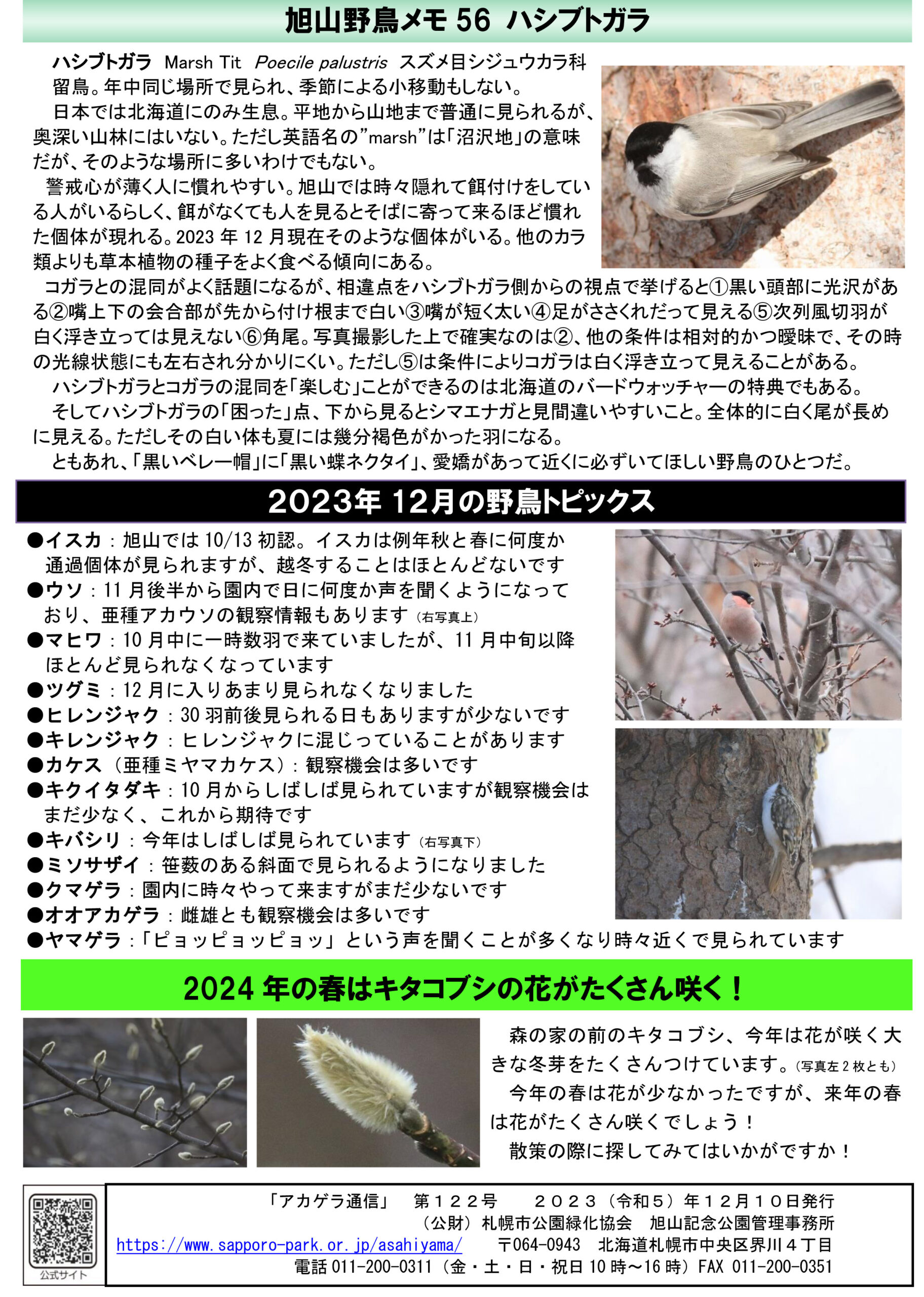 旭山野鳥ノートは「ハシブトガラ」、野鳥情報、キタコブシの花が来春はたくさん咲きそう、といった話題です。