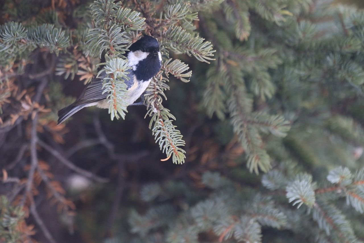 ヒガラは針葉樹のてっぺん付近で囀りします。