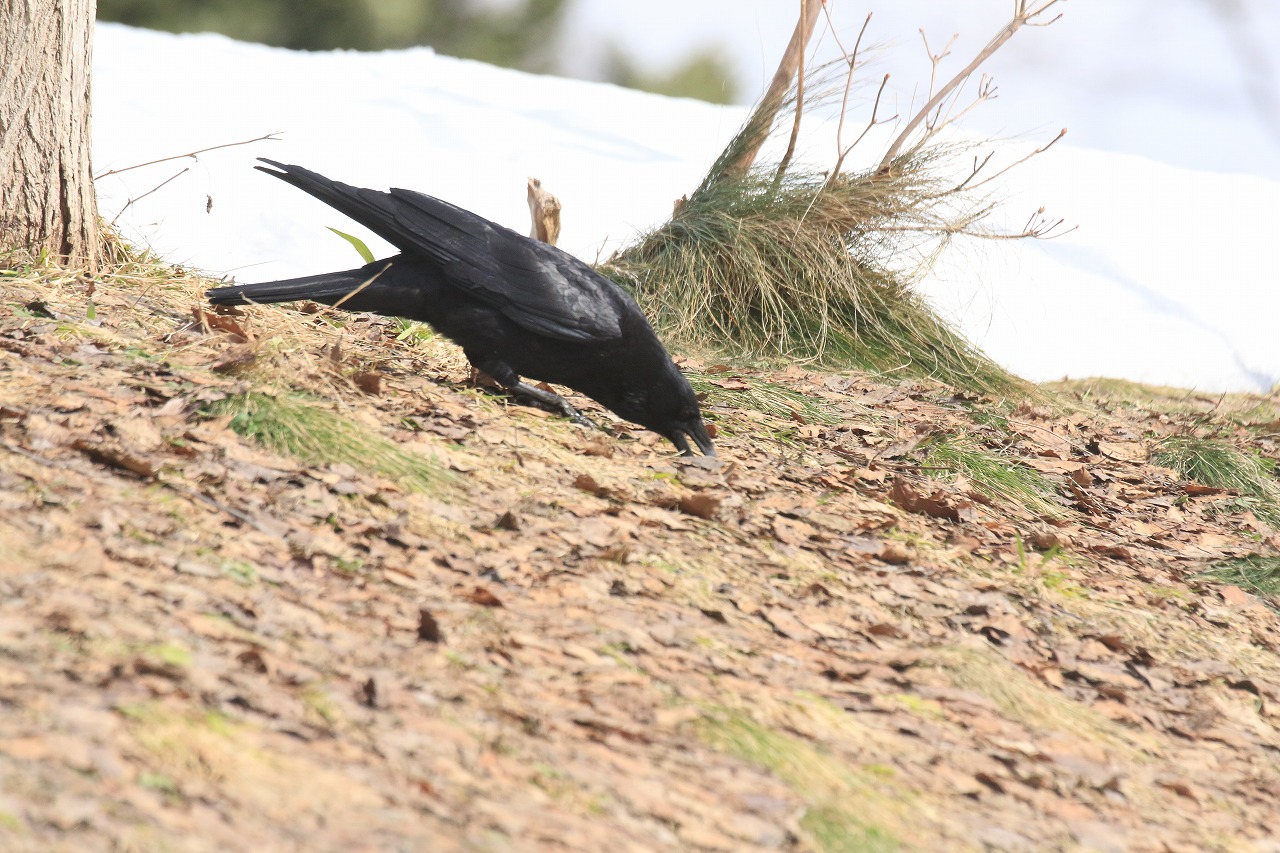 例年4月から5月にかけての頃には「学びの森」で地面に降りて採餌する姿がよく見られますが、今年は今日4月6日時点でまだ学びの森周辺は雪が解けておらず、土が出ていません。