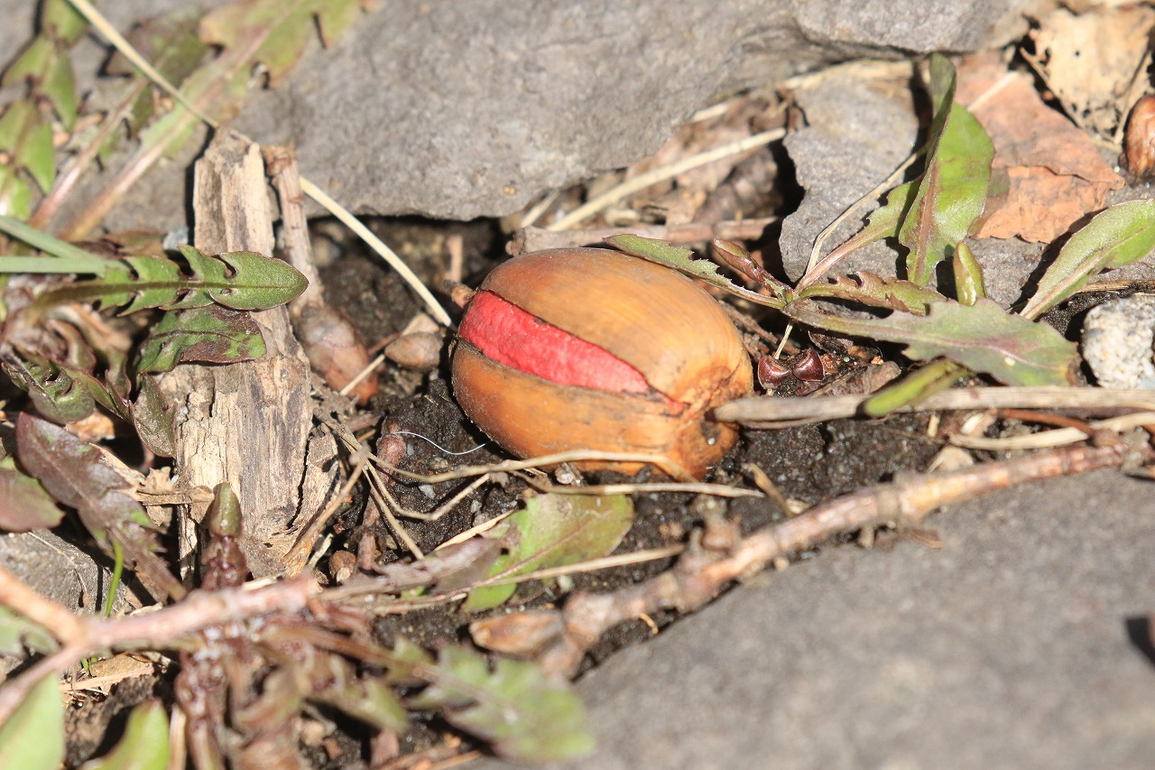 前年秋に発芽しかけて寒くなり止まった赤いどんぐり、今年もありました。
