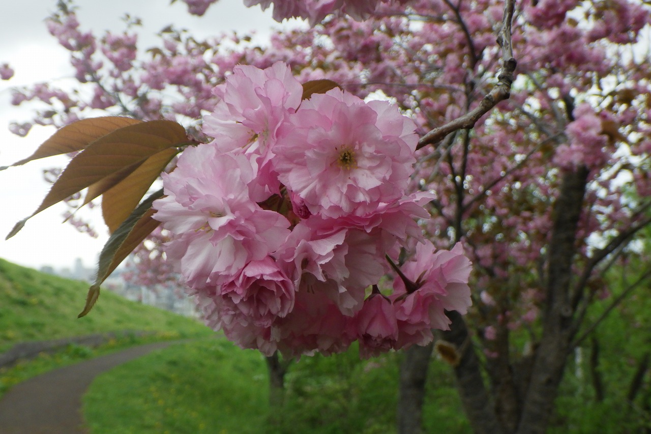 新桜並木の10数本ある八重ザクラも満開で見頃です。