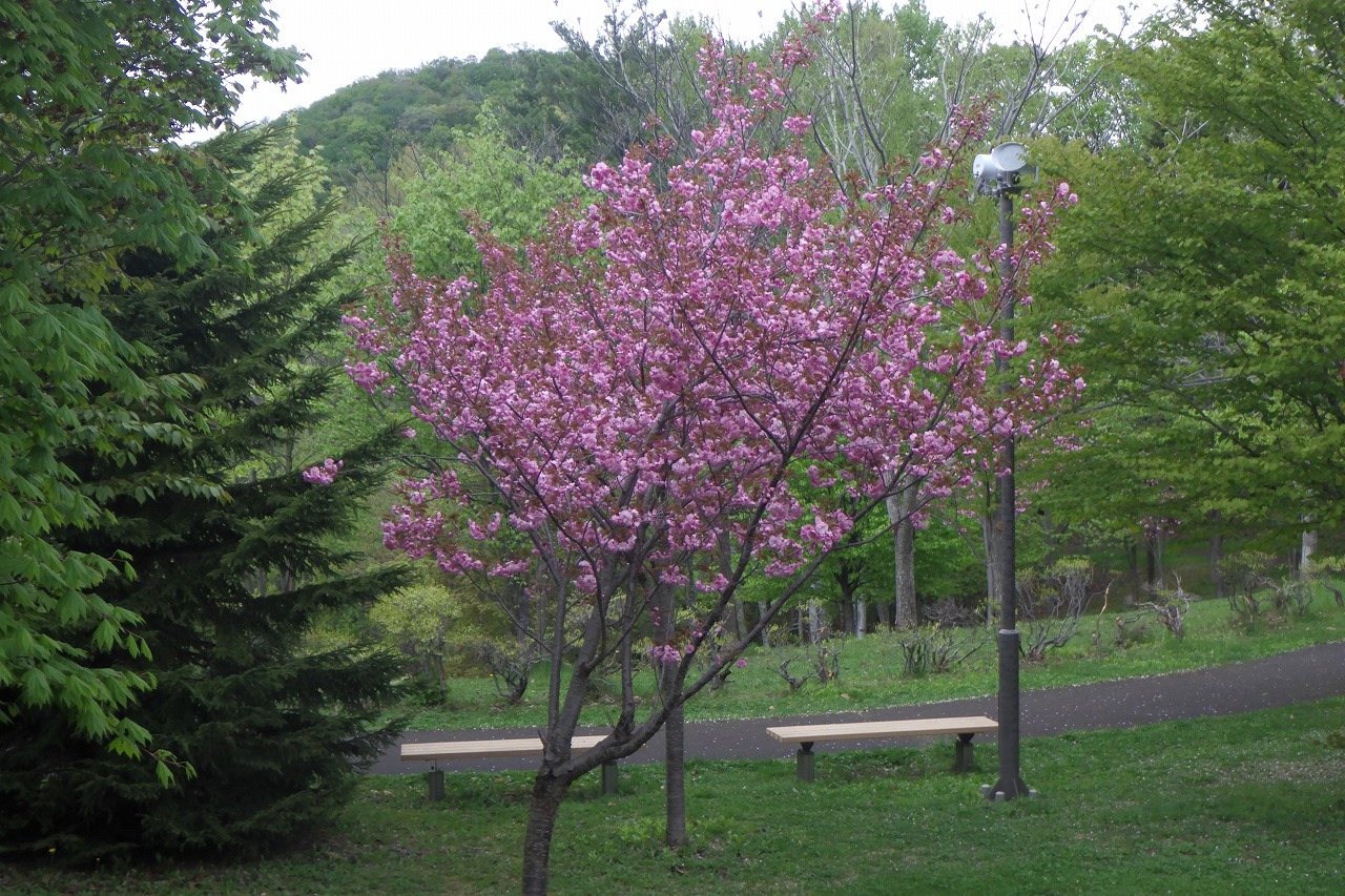 新桜並木を過ぎて、ピクニックテラスにある八重ザクラ。