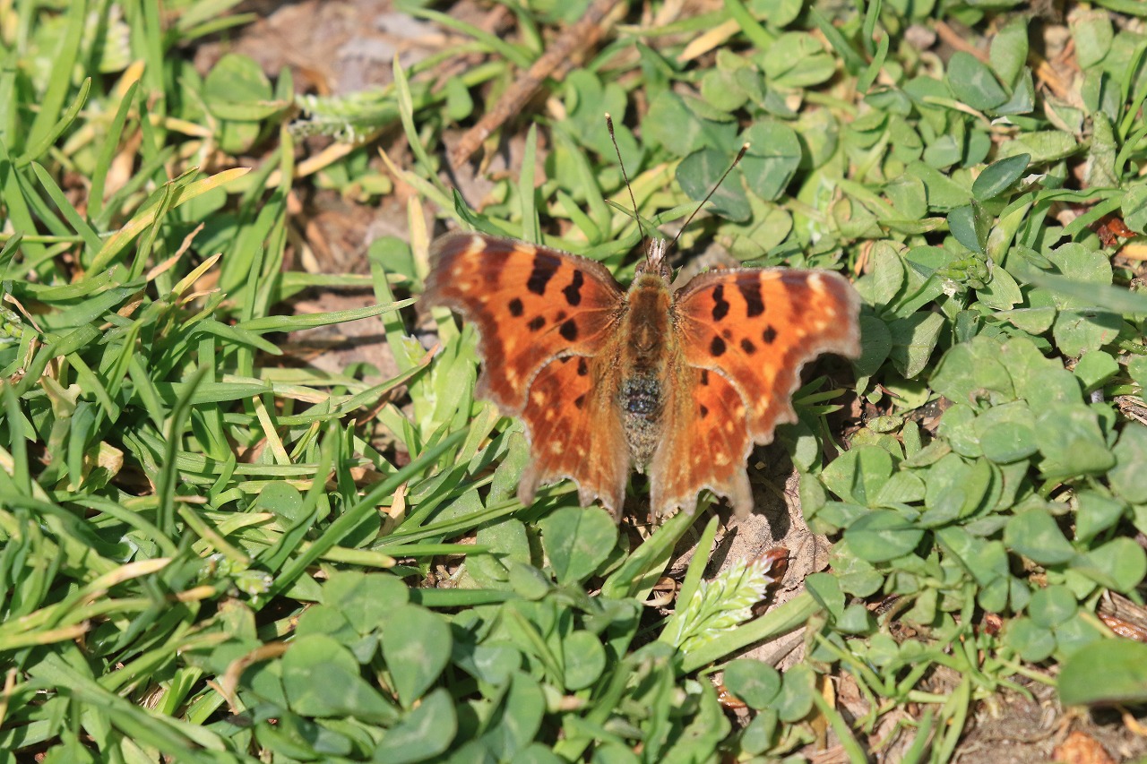 名前の由来は、翅の裏側の茶色い部分にアルファベットの”C”の形をした白い紋があることですが、このように翅を開いてとまっているとそれは見えません。