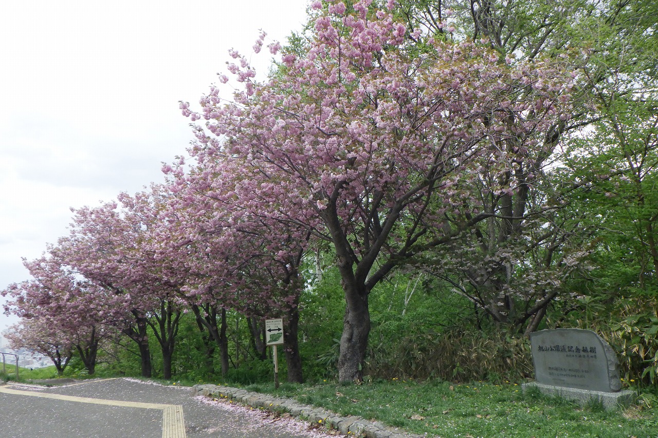 旭山公園通りの石碑の裏にひっそりとある白い花の八重桜もまだまだきれいです。