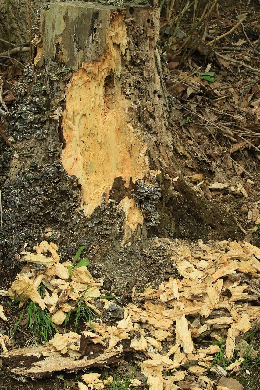 写真は園内「森の家坂」で今朝撮影したもので、どうやら昨日ここにクマゲラが来てこの枯れ木(ハルニレ)を派手につついて木くずを散らかしていったようです。