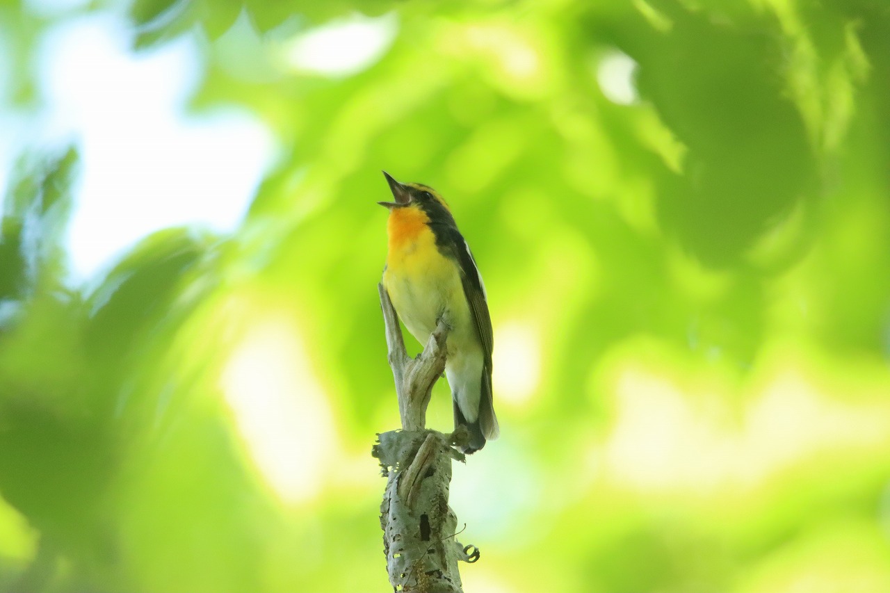 先週お伝えした、旭山都市環境林「お寺跡地」辺りでクマゲラの鳴きまねをするキビタキ、今日現在まだいます。