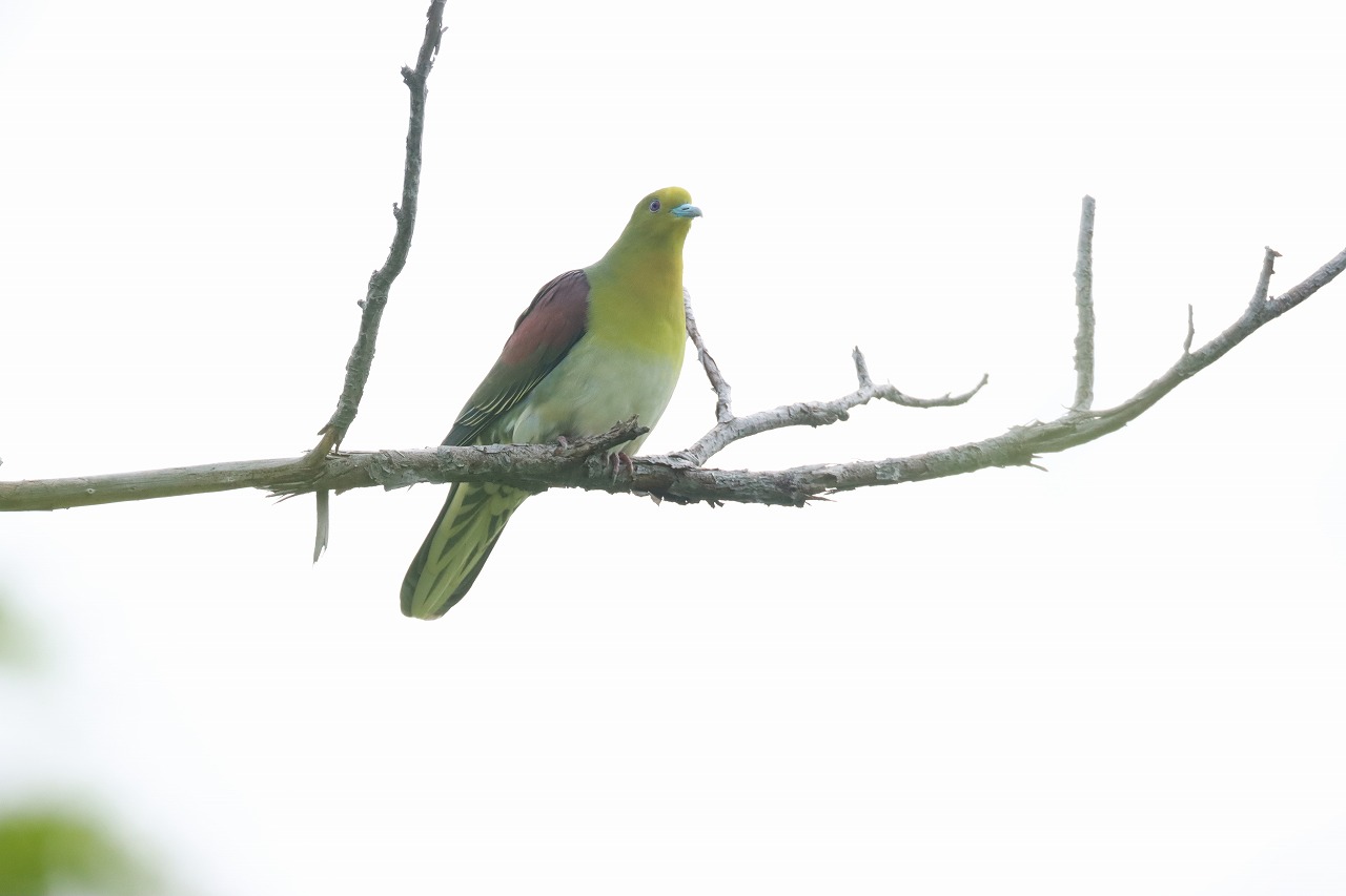 ミュンヘンの森で観察する際は、飛んで来たのを見て動くと、アオバトは警戒心が強くてすぐに飛び去るので、木の陰などで待っていると近くで見られることがあります。
