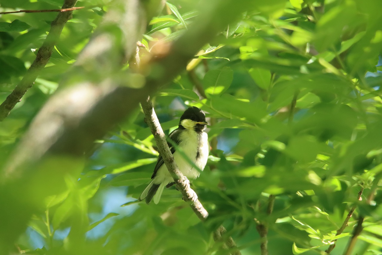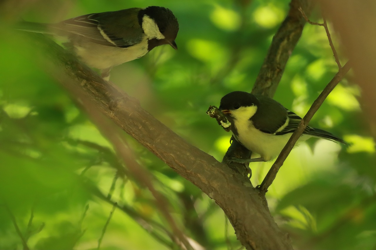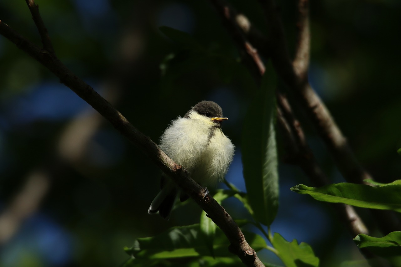 写真はその時のもので、シジュウカラの幼鳥は巣立ち後は「ネクタイ」がおなかまで達しておらず、顔の黒い部分も頬の下でまだつながっていないのが特徴です。
