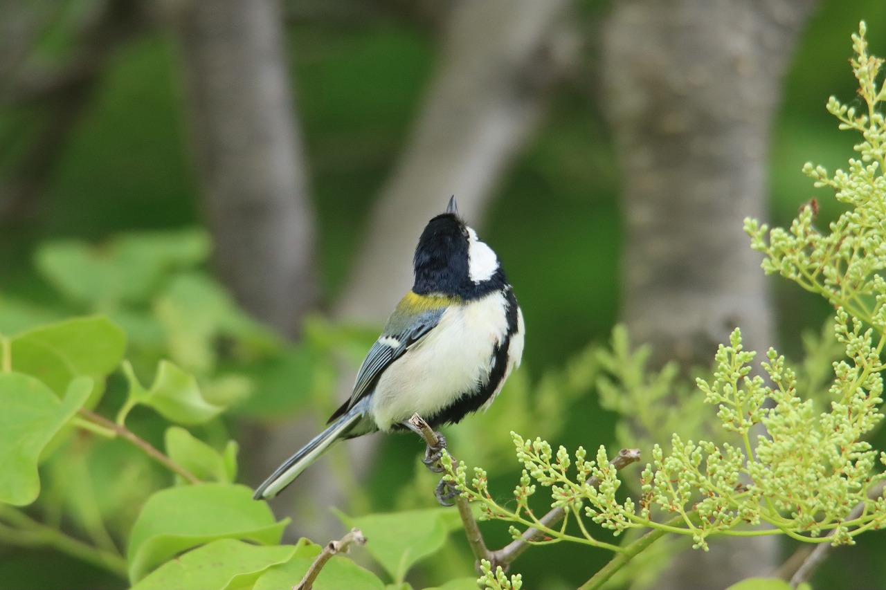 この写真は、桜(エゾヤマザクラ)の実がなる木にとまっているシジュウカラ幼鳥です。