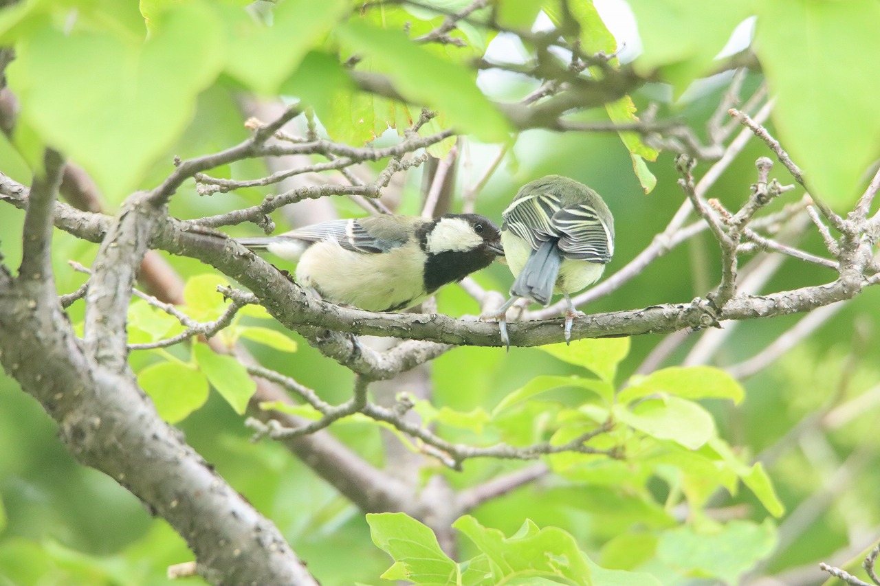 次の写真のように親(写真左、雌)が巣立ち雛に餌をあげるシーンも見られます。