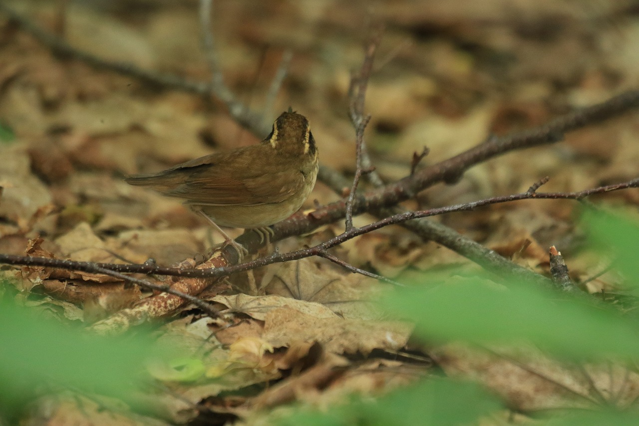 写真は6月10日い撮影されたものですが、頭央線(頭部を前から後ろに走る戦場の色が薄い部分)がなく、撮影時にオオムシクイがそこで鳴いていたので、オオムシクイであると判断しました。