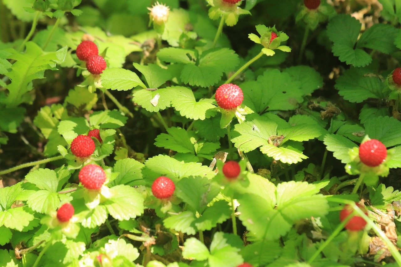 やはりバラ科の草本、今月上旬に花が咲いていたヘビイチゴ、もう赤い実がなっています。