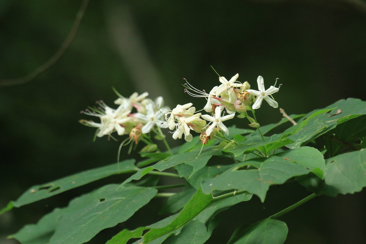 クサギは「かわいそうな名前」の植物のひとつで、葉を揉むと「臭い」のでこの名前になりましたが、花はキンモクセイ系のいい香り、近くを通ると漂ってきます。