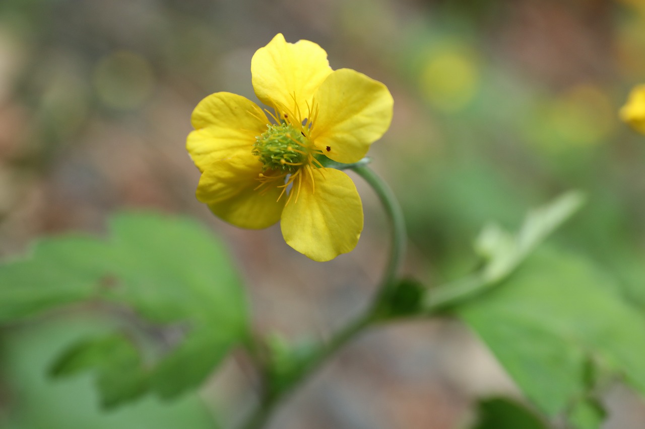 園内のやや暗い林縁、散策路脇にたくさん咲いている黄色い花。