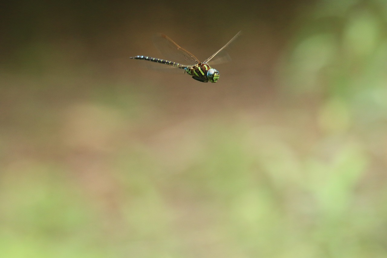 ルリボシヤンマは同じ場所に1~3秒ホバリングしながらとまっていることがあり、その時には空中で写真が撮れます。