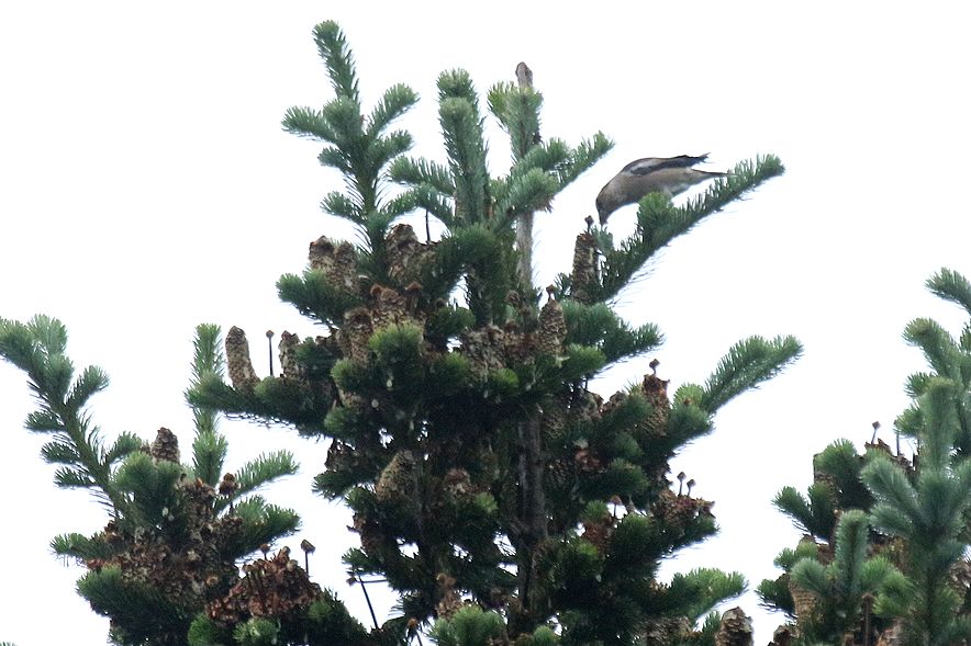 下2枚はシメの写真ですが、1枚目、シメが何かを食べようとしている写真をクリックし拡大して見ていただくと、トドマツの葉の間に上向きに棒状に立っているものや、松ぼっくりのようなものが見えるかと思います。