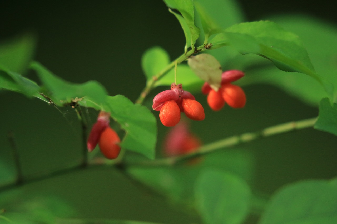 先週取り上げたツリバナと同じニシキギ科の低木、コマユミも赤い果実がなっています。