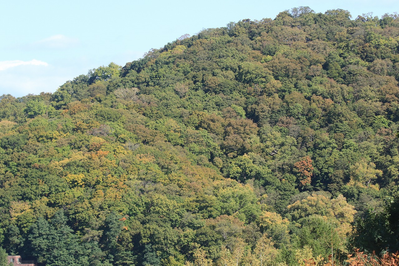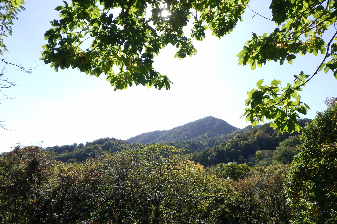 展望台から西側を望むと、色づき始めている神社山と三角山が見えます。