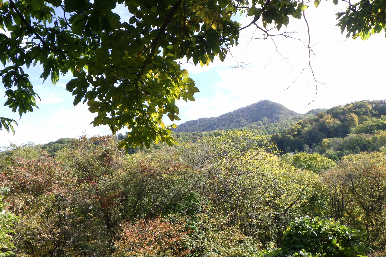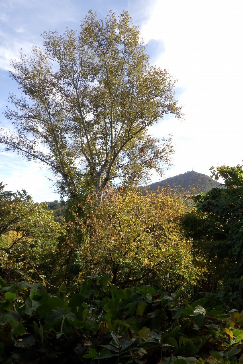 「山紅葉坂」上ってすぐの左手、「旭山記念公園でいちばん高い木ドロノキ」とその向こうの藻岩山。